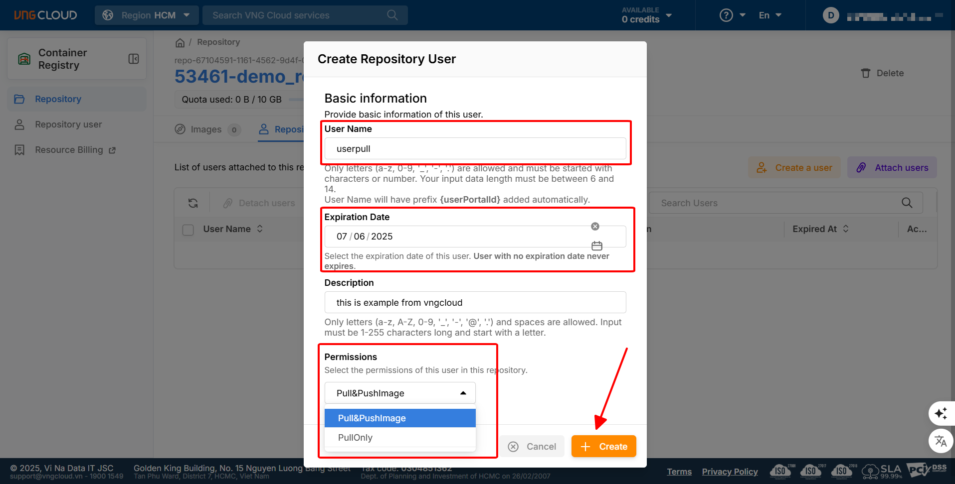 Với Region HCM: https://vcr.console.vngcloud.vn/repository/list