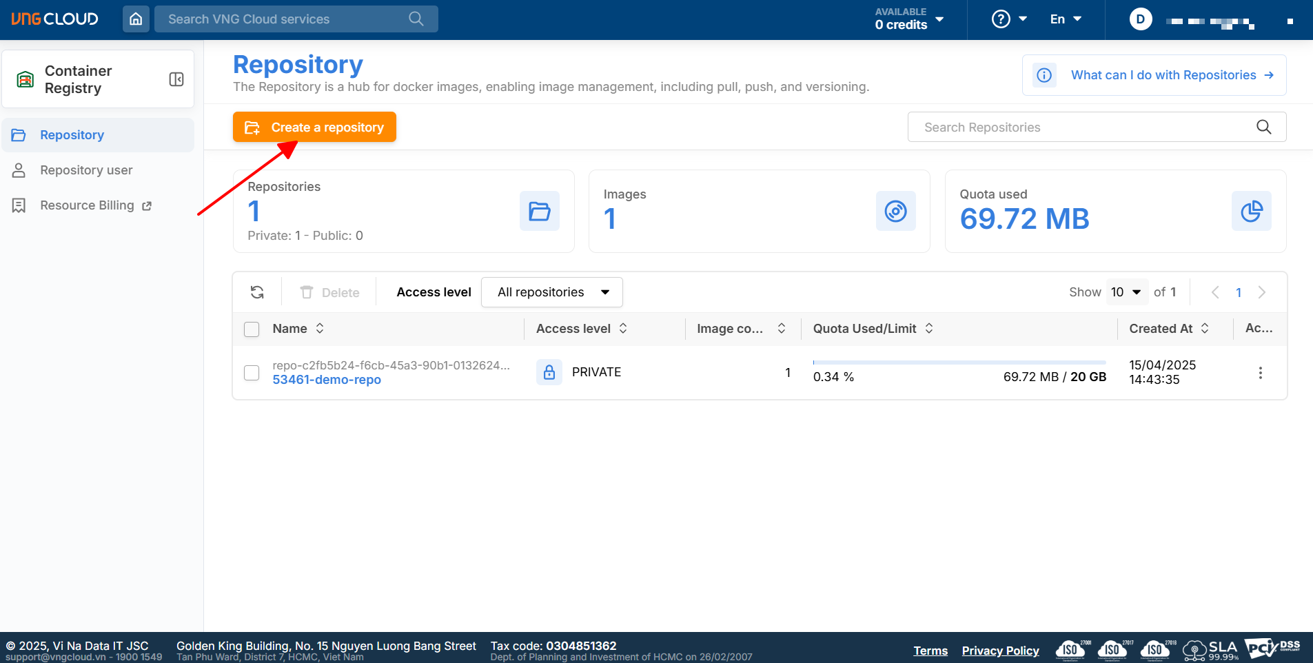 Bước 1: Truy cập Portal của vContainer Registry.