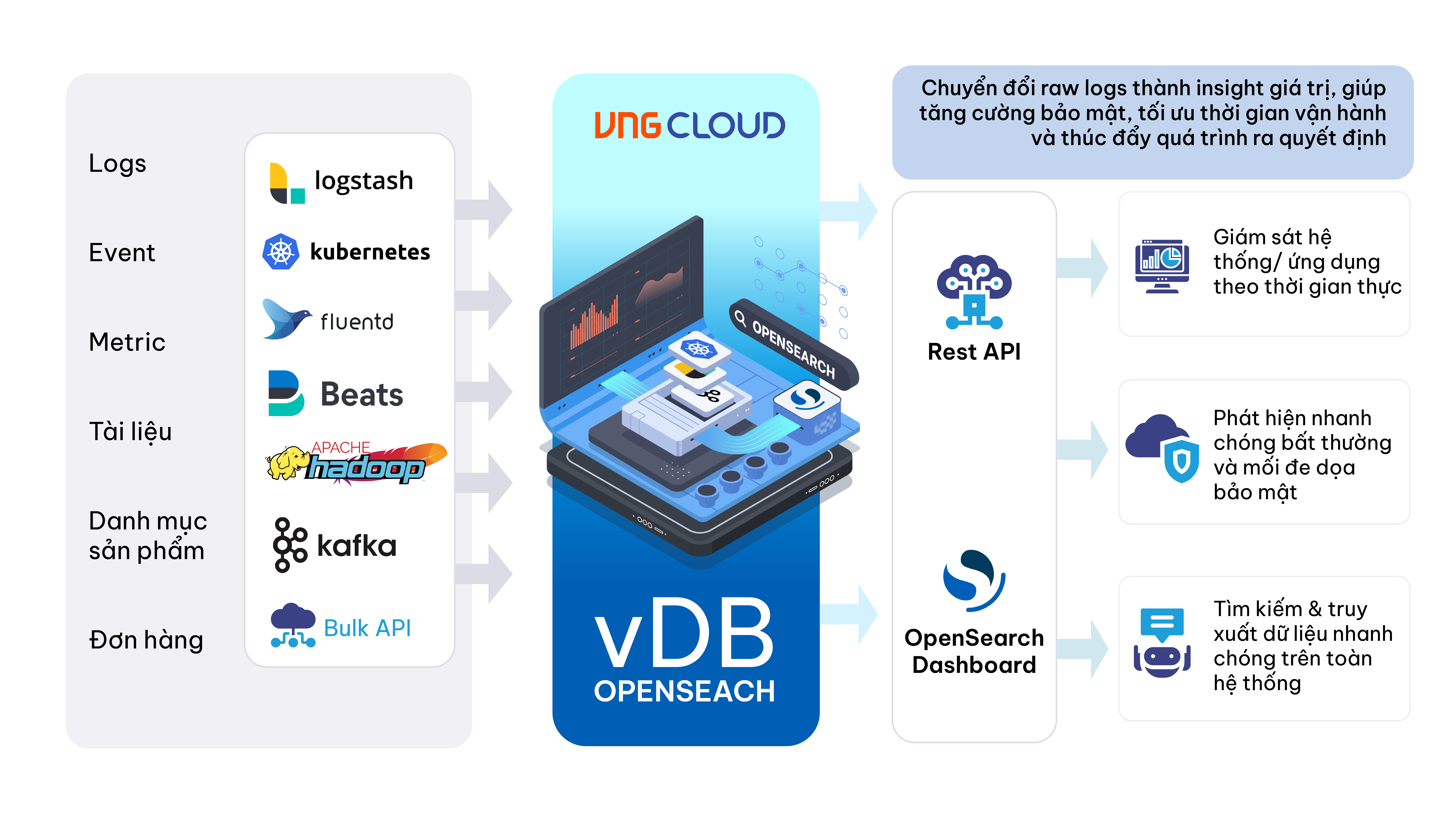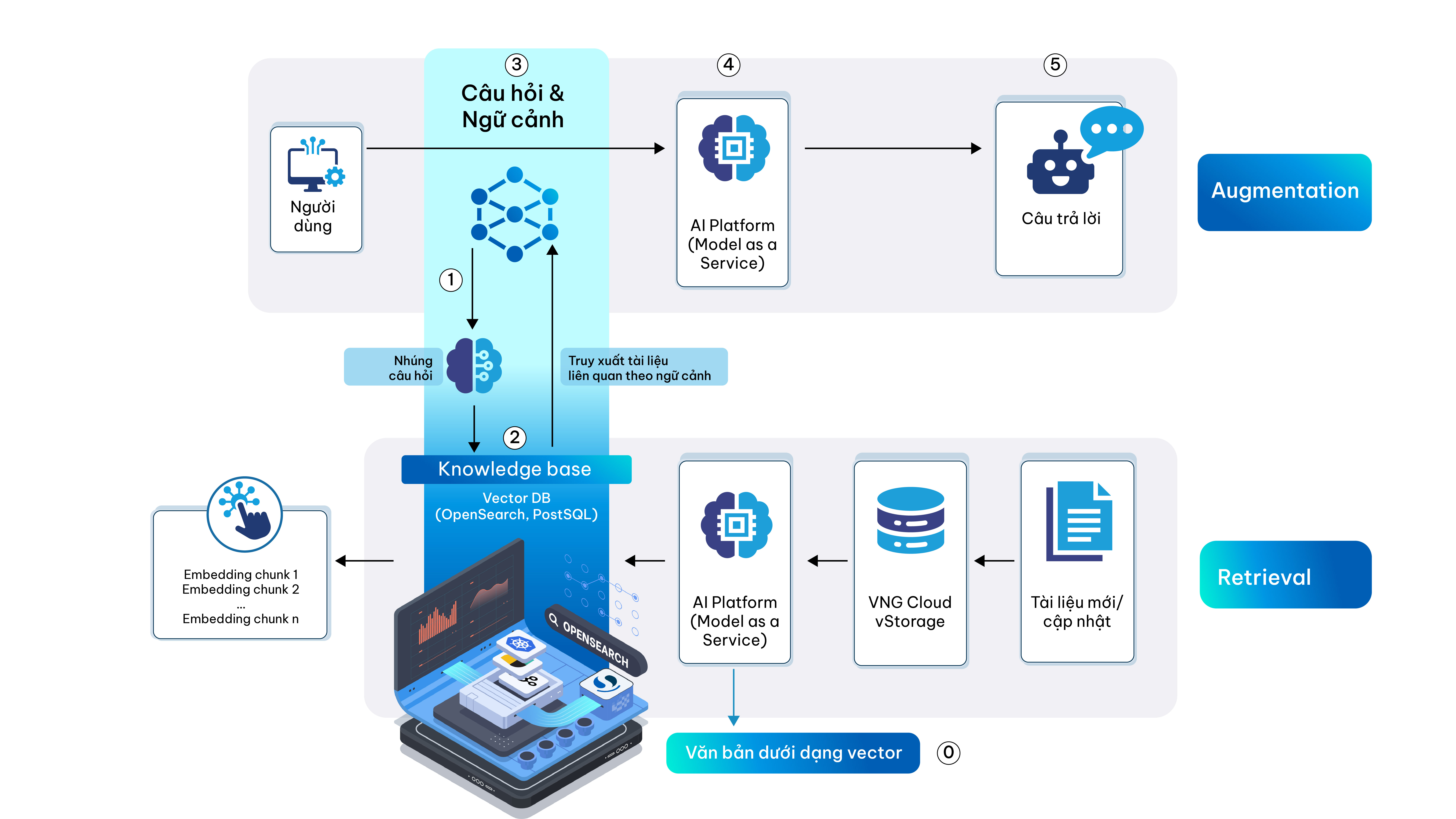 Hiện tại, vDB đã hỗ trợ bạn triển khai **OpenSearch** làm **Vector Database**, tức là sử dụng nó để **tìm kiếm gần đúng (k - Nearest Neighbor - kNN)** trên các vector embedding bằng cách tích hợp sẵn kNN plugin trên OpenSearch Cluster của bạn. Đây là một cách phổ biến để xây dựng hệ thống tìm kiếm vector cho **AI/ML, NLP, Recommendation Systems, hay Semantic Search**.