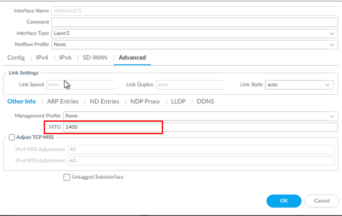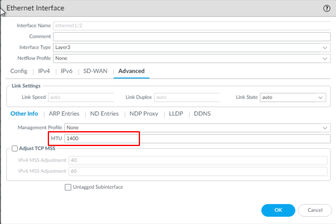 * Chuyển sang tab **Advanced**, ở phần **MTU** bạn chỉnh thành 1400