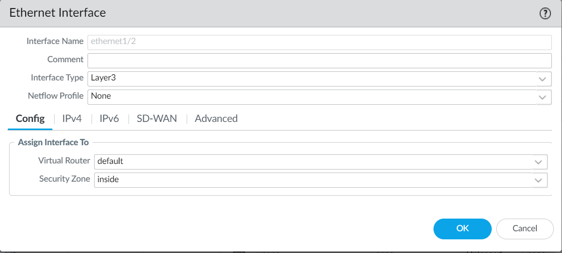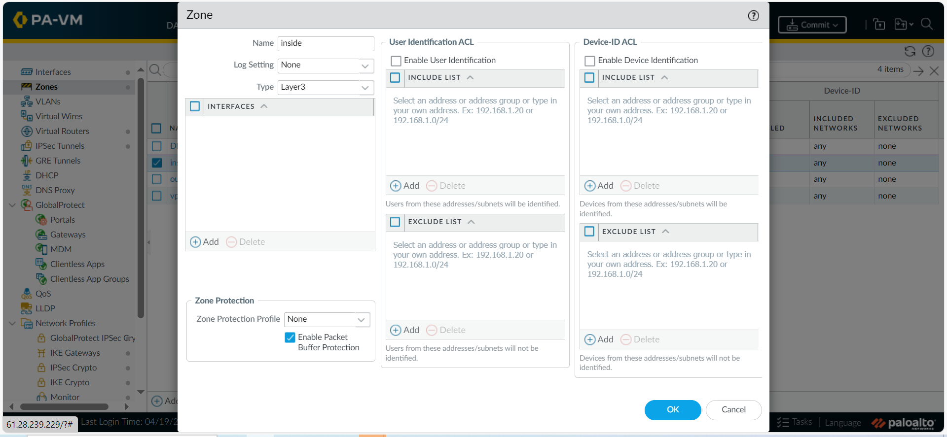 * Đặt tên cho **Zone**: **Inside** sau đó chọn **OK**