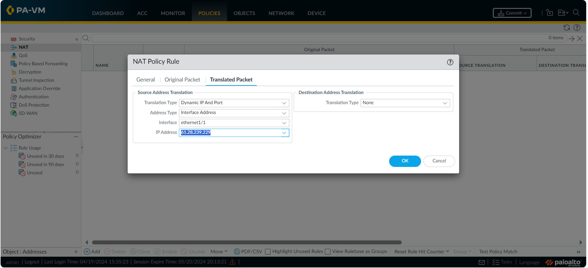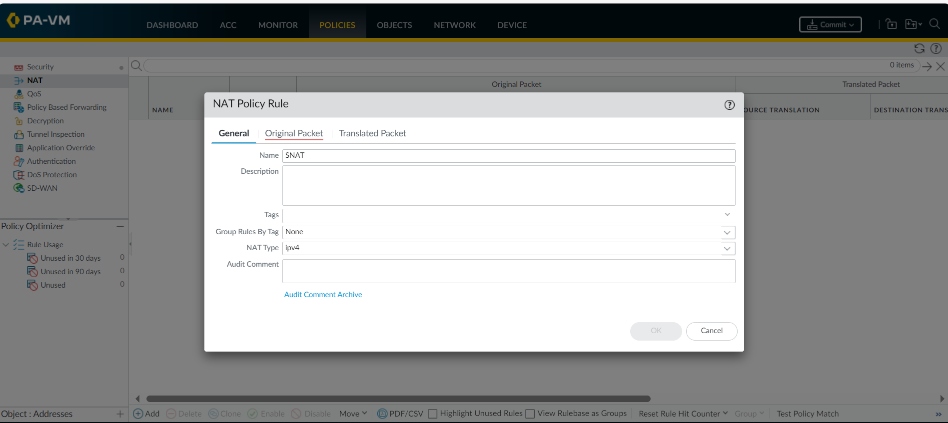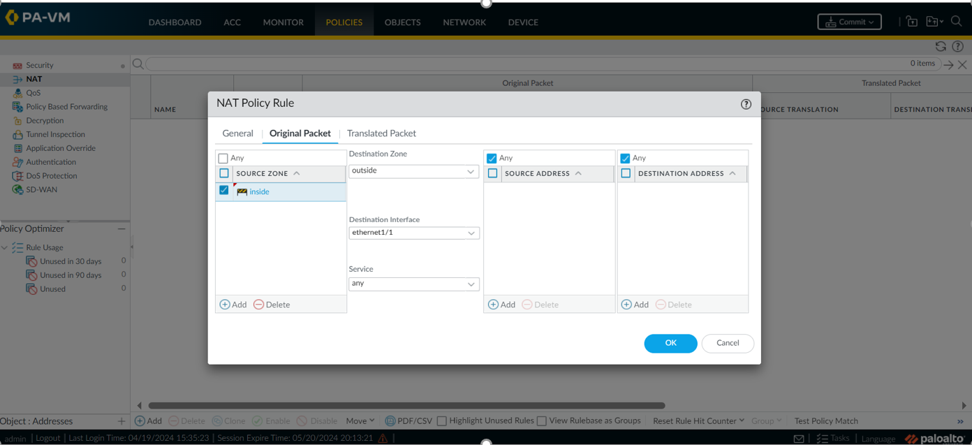 * Tại tab **Original Packe**t chọn **Source Zone, Destination Zone, Destination Interface, Service, Source Address, Destination Address**