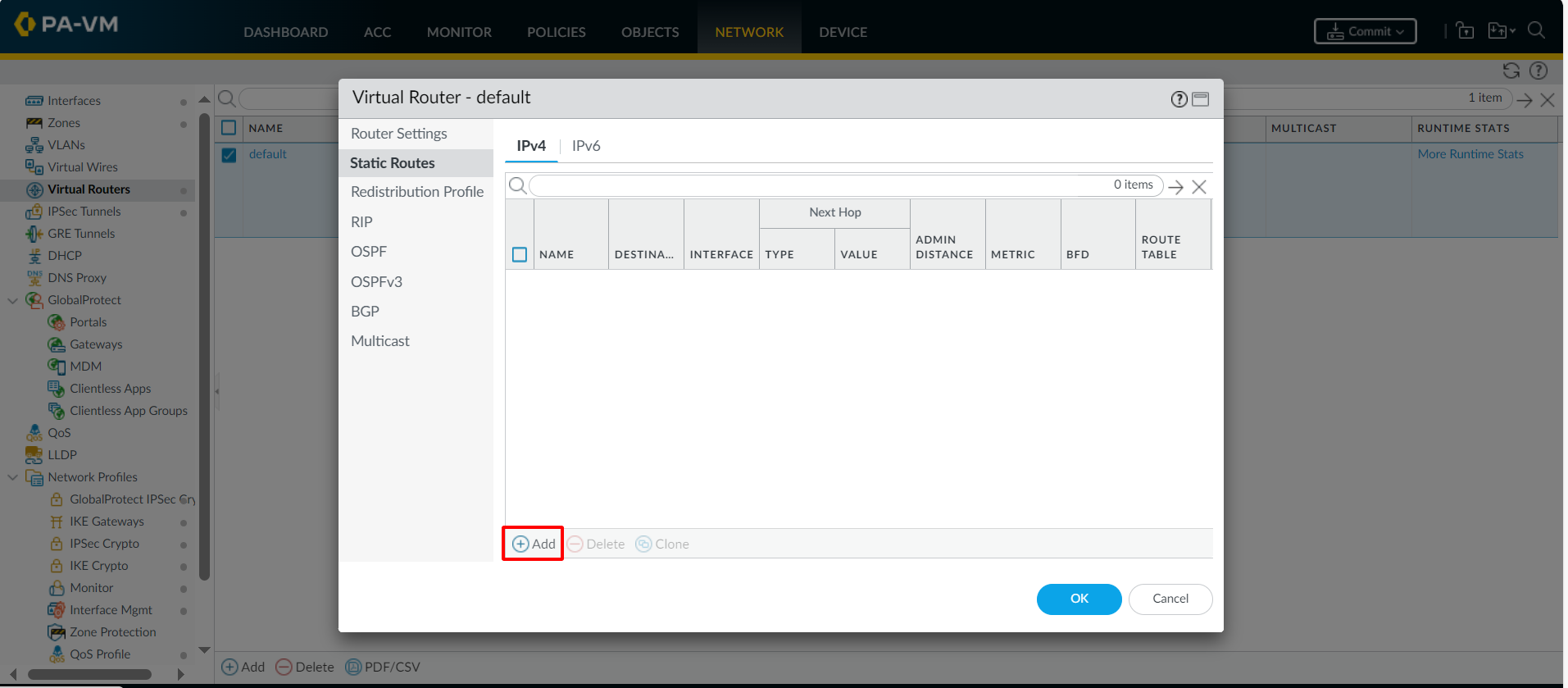 * Vào phần **Network** -> **Virtual Routers**-> Chọn **default**-> Chuyển sang mục **Static Routes**