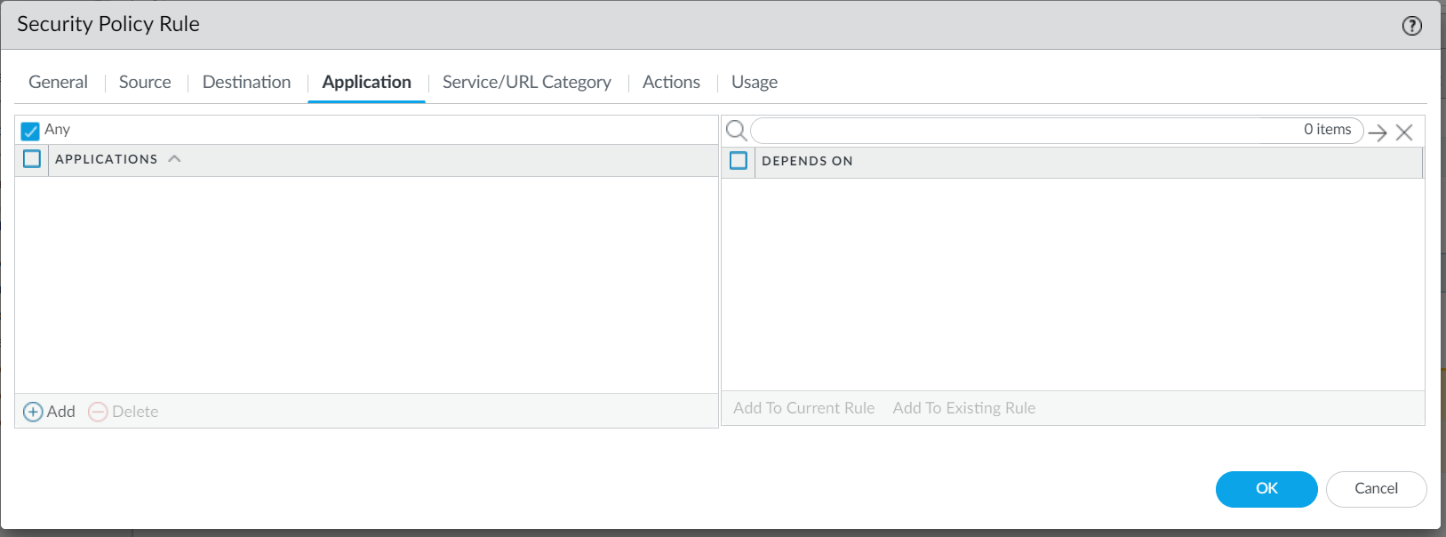 * Tại tab **Application**, thiết lập các thông tin như **Application, Depend On**