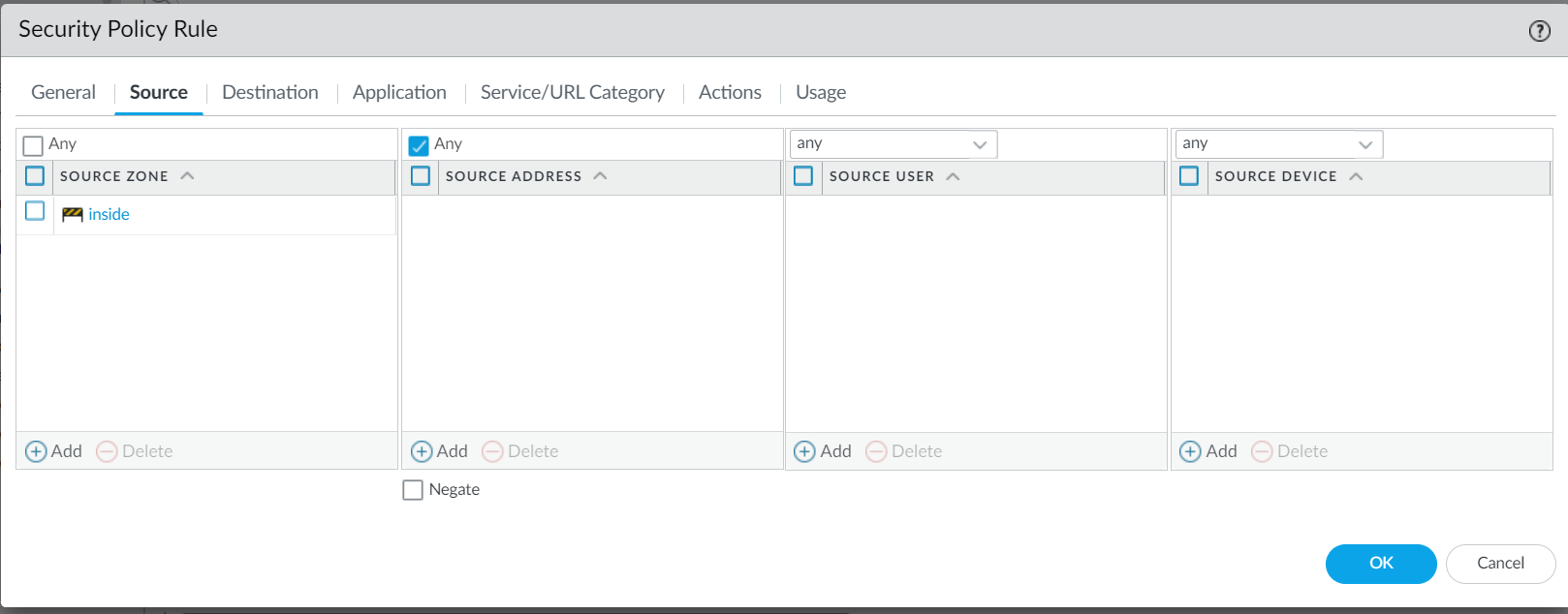 * Tại tab **Source**, thiết lập các thông tin như **Source Zone**, **Source Address**, **Source User, Source Device**