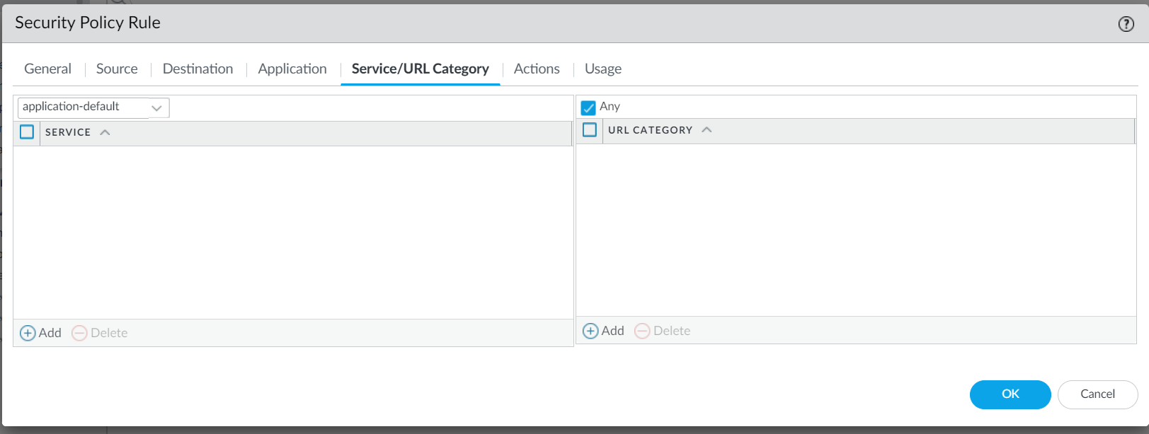 * Tại tab **Service/URL Category**, thiết lập các thông tin như **Service, URL Category**