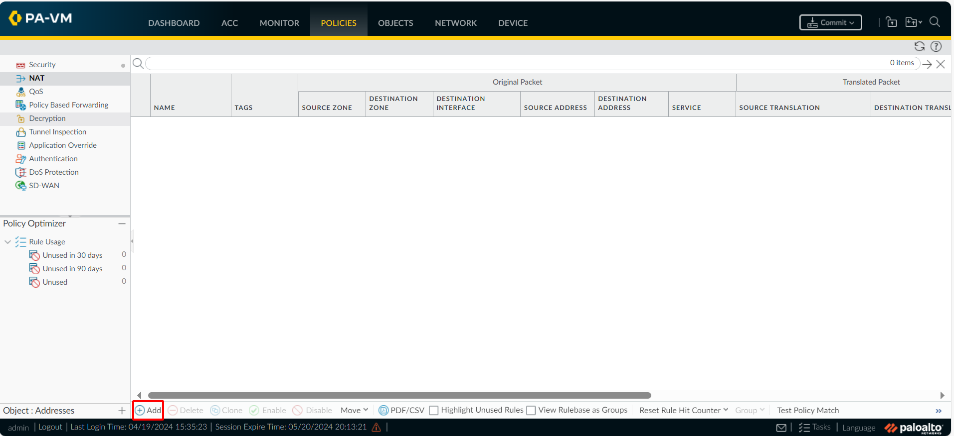 * Vào phần **Policies** -> **NAT** -> **Add**