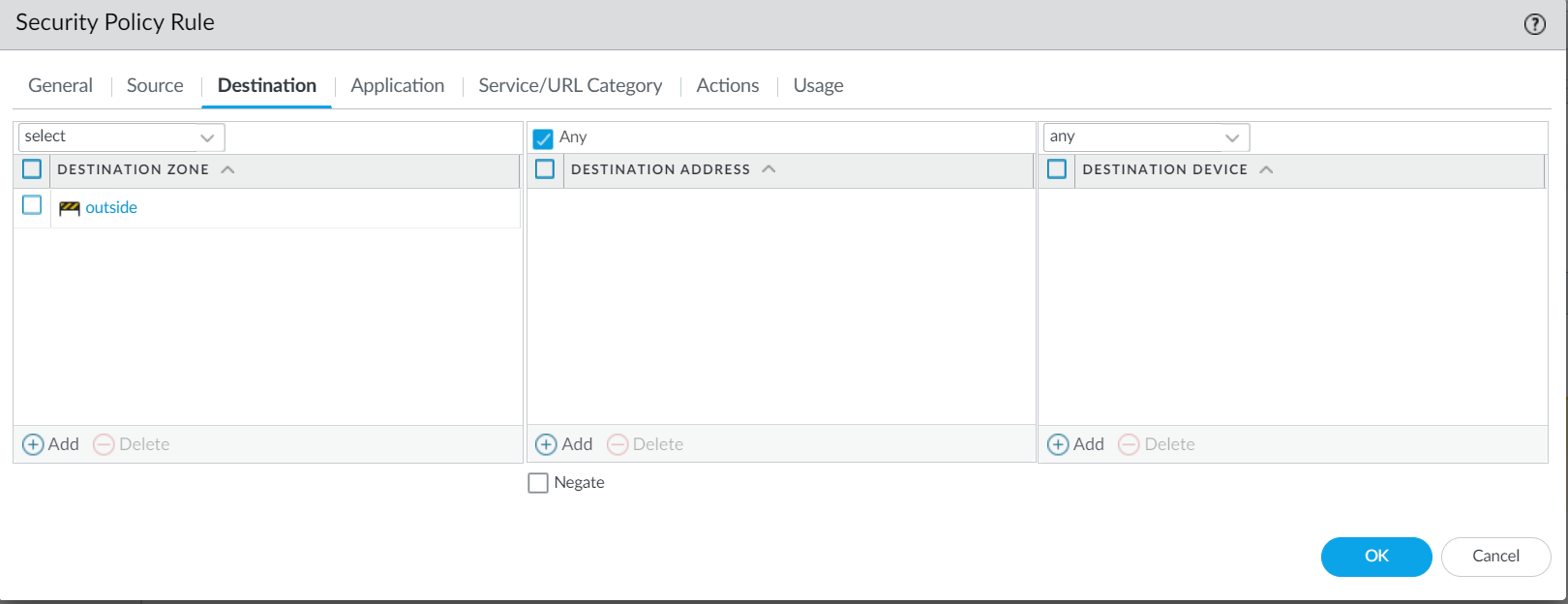 * Tại tab **Destination**, thiết lập các thông tin như **Destination Zone, Destination Address, Destination Device**
