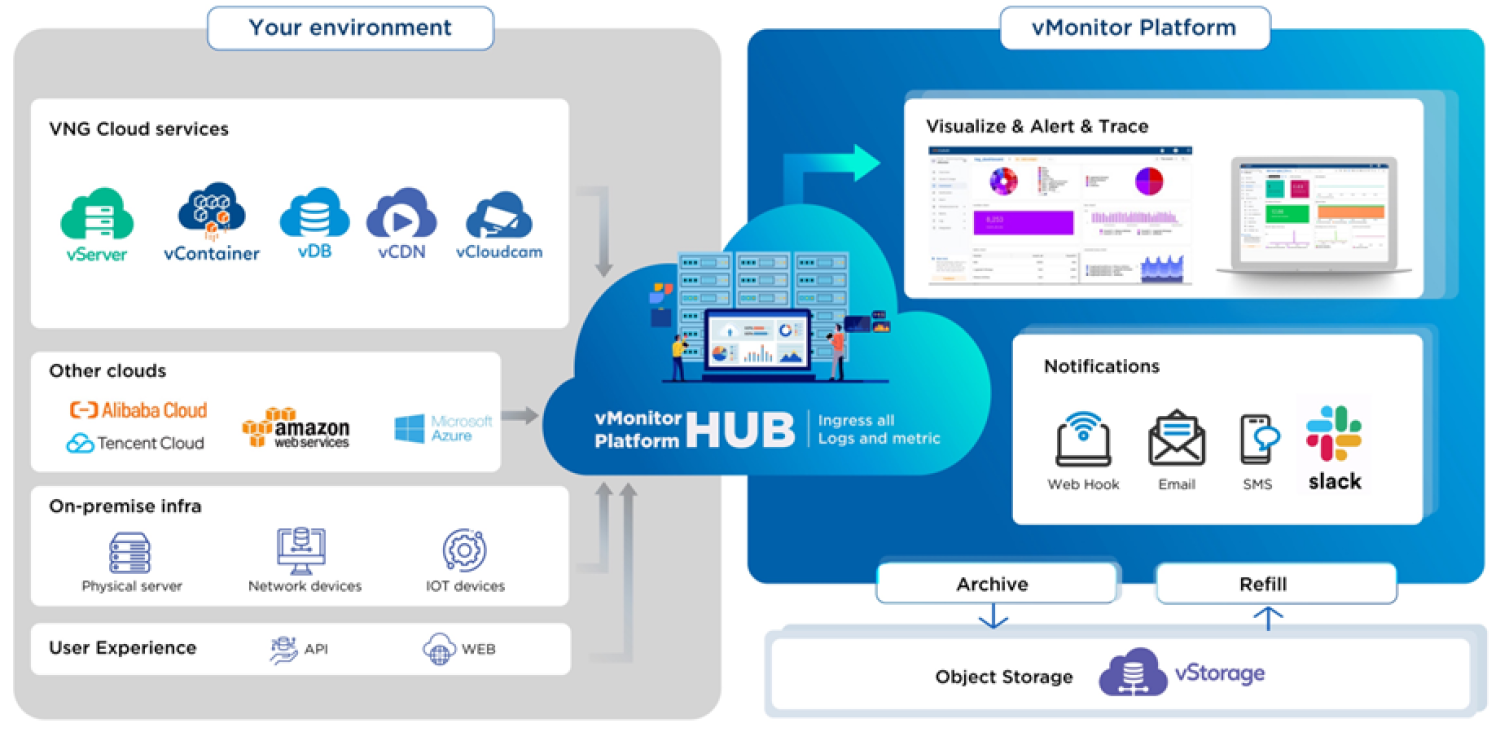 vMonitor Platform mang tới một giải pháp toàn diện cho việc thu thập, phân tích và cảnh báo trên dữ liệu Metric và Log từ GreenNode, các Cloud khác hay môi trường on-premise. Những thông tin này giúp bạn hiểu rõ hơn về hoạt động của các server/application của bạn và chủ động xác định được các vấn đề mà server/application đang gặp phải.