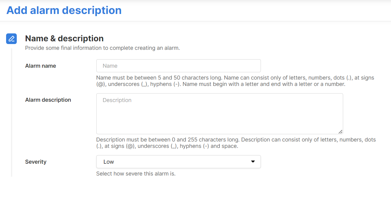 * Tên Alarm không nên chứa các thông tin nhạy cảm (ví dụ địa chỉ IP, tên tài khoản, mật khẩu đăng nhập,...).