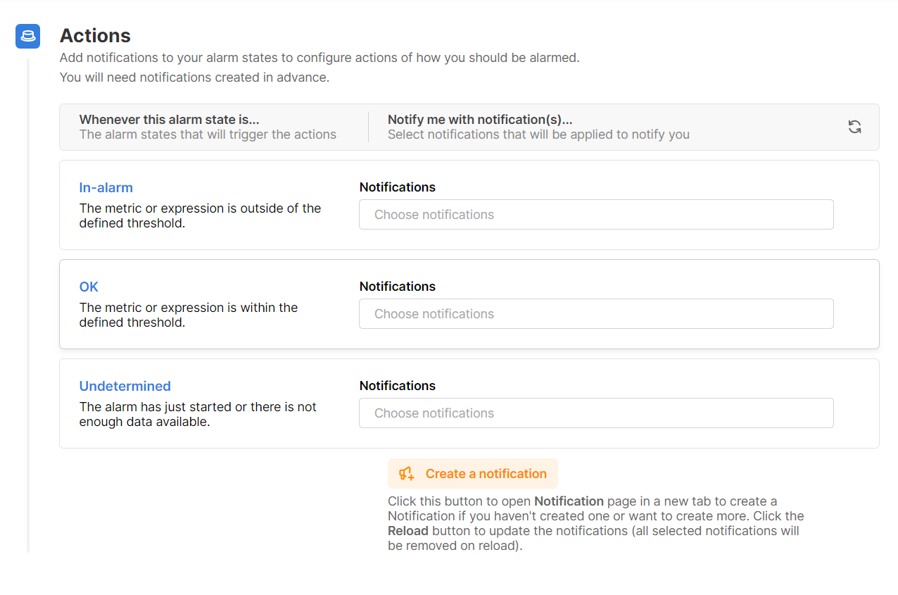 7\. Trong mục **Actions**, bạn cần thiết lập điều kiện hệ thống sẽ thông báo đến đâu (Notification). Kết quả **Alarm** khi chạy sẽ bao gồm 3 trạng thái: