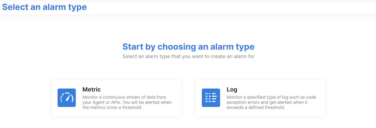 4. Trong mục **Select an alarm type**, chọn **Metric** nếu bạn muốn thiết lập cảnh báo dựa trên dữ liệu metric hoặc chọn **Log** nếu bạn muốn thiết lập cảnh báo dựa trên dữ liệu log.