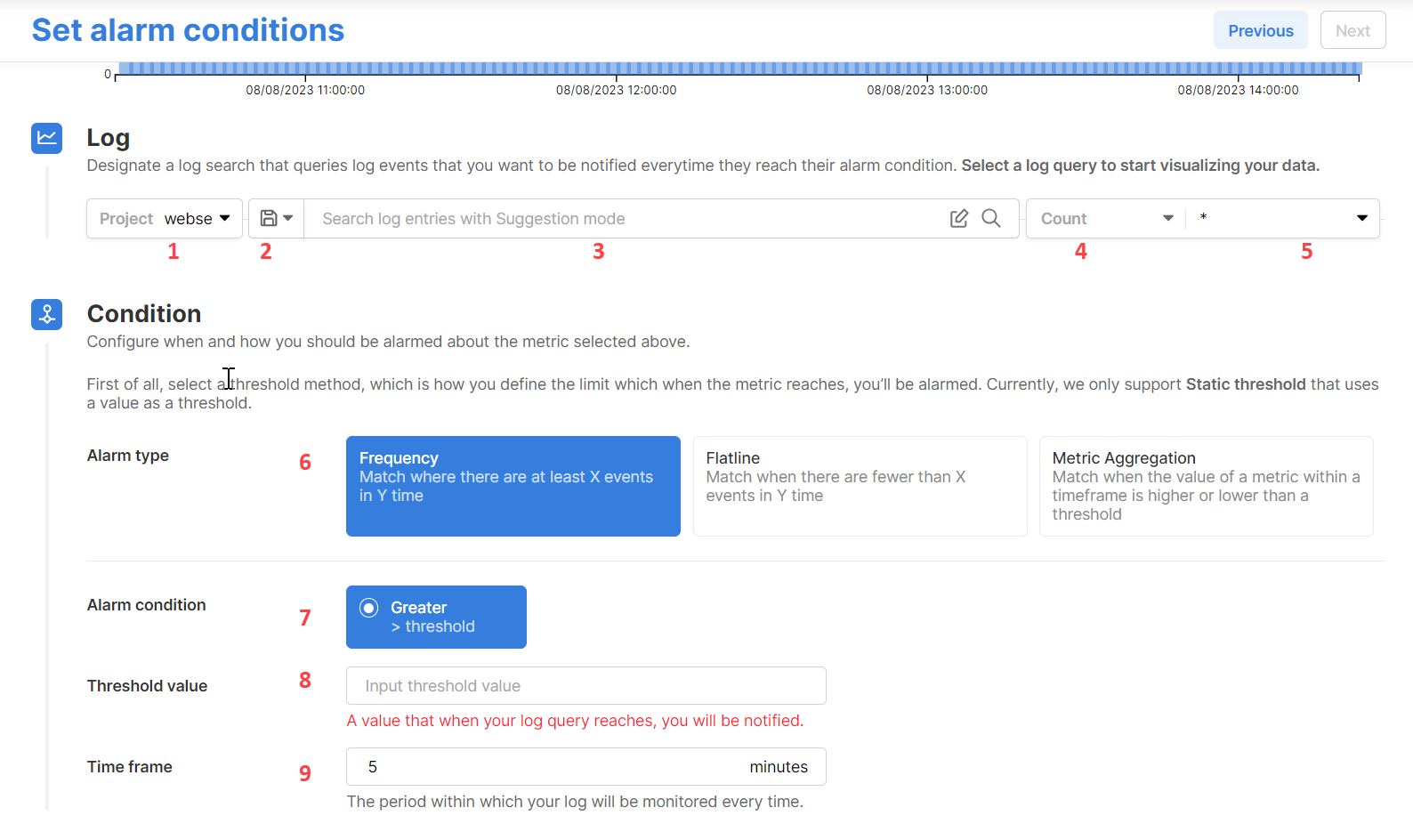 * Đối với Alarm type loại Frequency và Flatline, chúng tôi hỗ trợ bạn sử dụng phép toán count - tức đếm số lượng bản ghi logs sinh ra.