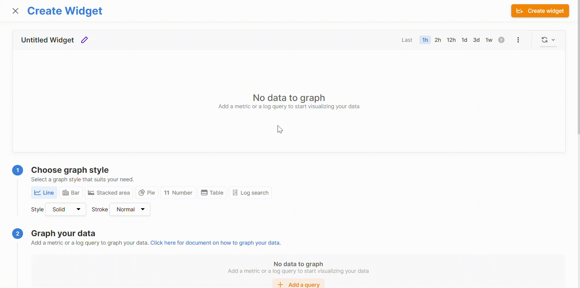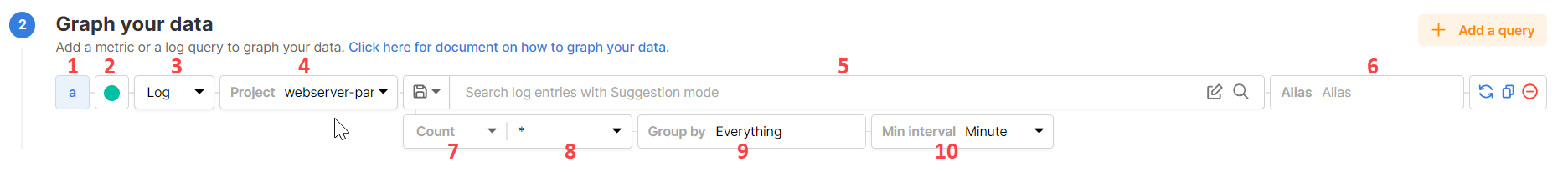 Khi bạn tạo **Widget** cho dữ liệu **logs**, trong phần **Graph your data**, tạo câu lệnh truy vấn dữ liệu của bạn bằng cách chọn **Add a query**. Mỗi câu lệnh truy vấn sẽ được thể hiện bởi một line, bar, stacked area, pie, number, table hoặc một giao diện log search trên biểu đồ. Các thành phần tạo nên câu lệnh truy vấn đối với dữ liệu logs bao gồm: