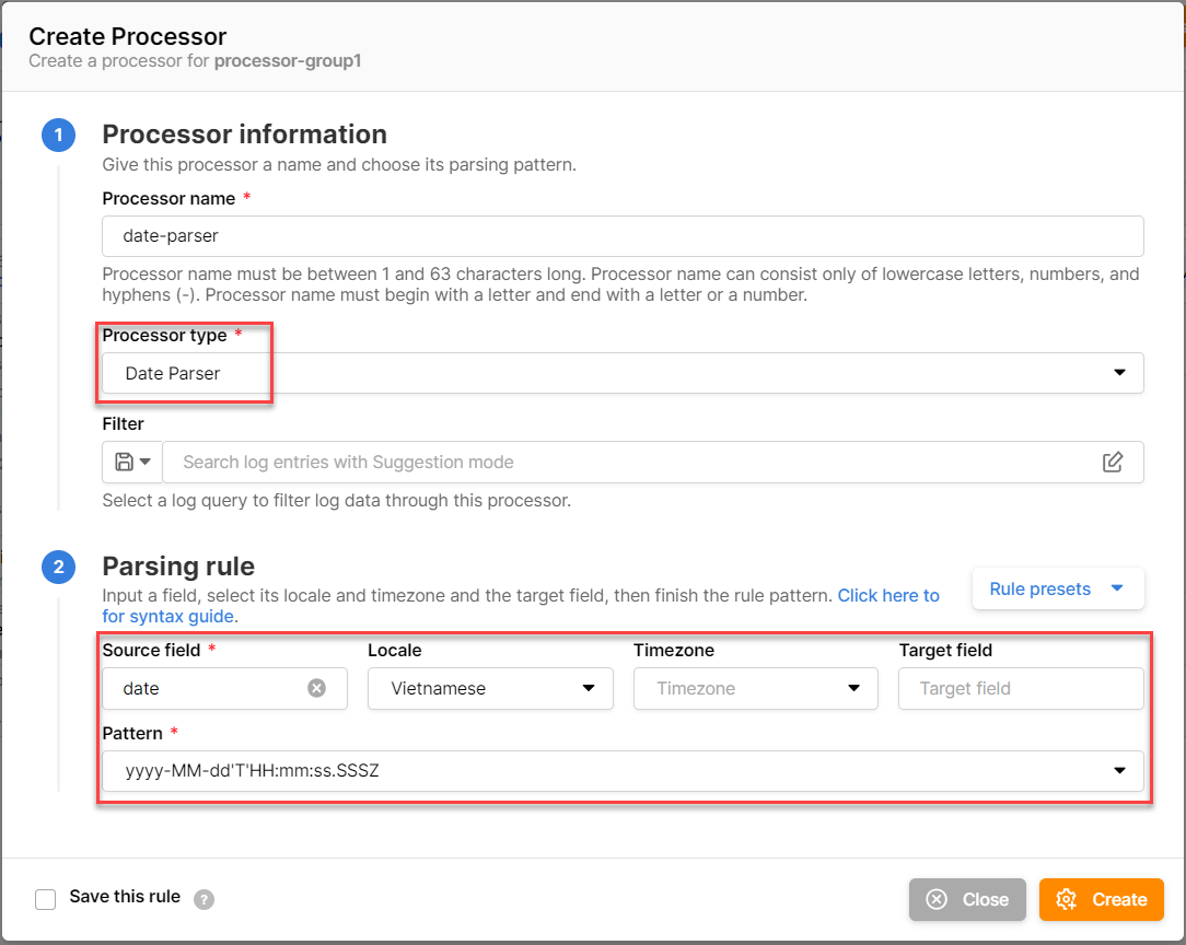 * Sau khi parsing rule đã được lưu trữ, trong các lần tạo processor kế tiếp bạn có thể tái sử dụng rule này bằng cách chọn **Rule presets** tại mục Pasing rule.