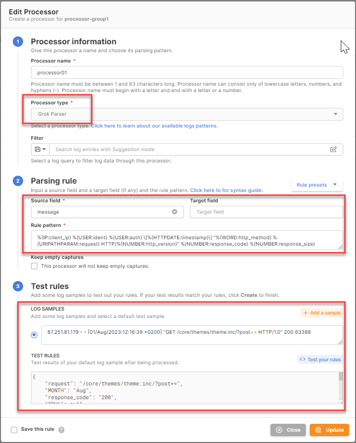 2.3 Nhập **Rule pattern**: chứa grok pattern để matching với source field và parse ra theo cấu trúc.