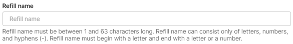 6. Nhập **Refill name** theo quy định của chúng tôi. **Tên Refill** phải dài từ 1 (tối thiểu) tới 63 (tối đa) ký tự. **Tên Archive** có thể bao gồm chữ cái in hoa, in thường (a-z, A-Z), chữ số (0-9) hoặc dấu gạch ngang. **Tên Archive** phải bắt đầu bởi một chữ cái và kết thúc bởi một chữ cái hoặc một chữ số.