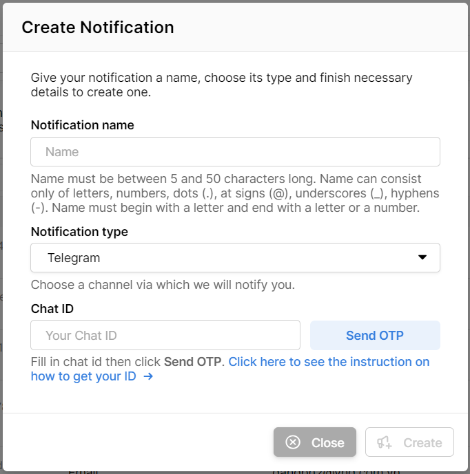Để tạo Notification với kênh gửi/ nhận là Telegram, hãy làm theo hướng dẫn bên dưới: