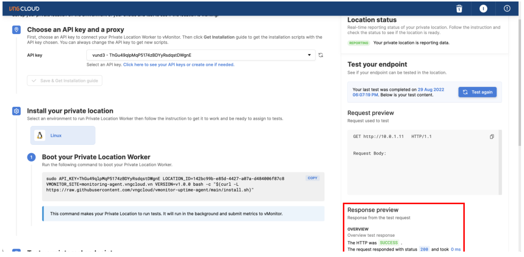 5. Bước kế tiếp **chọn API Key** để có thông tin xác thực giữa Private Location và GreenNode và chọn S**ave & Get Installation Guide** để hệ thống sinh ra các cấu hình và câu lệnh cần thiết để bạn cài đặt