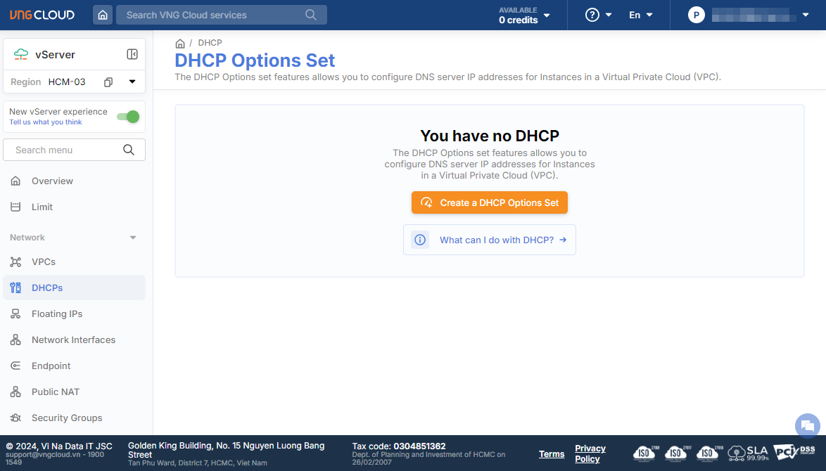 Chức năng Bộ tùy chọn **DHCP** (Dynamic Host Configuration Protocol) hay DHCP Options Sets cho phép bạn cấu hình địa chỉ DNS server IP cho máy chủ ảo (VM) của vServer trong VPC. Trước khi bạn có thể sử dụng DHCP options set, bạn phải có trước địa chỉ DNS server IP, sau đó bạn có thể gán (Associate) DHCP options sets với VPC. Sau khi DHCP options set được gán vào VPC, nếu tạo máy ảo VM có VPC sẽ sử dụng DHCP options set vừa tạo, thì sau khi DHCP options set được đồng bộ với các máy chủ VM, máy chủ đó cũng sẽ sử dụng DHCP option set đó.