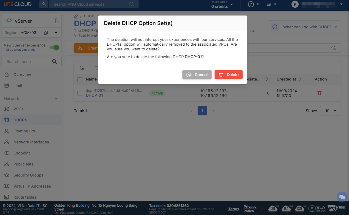 1. Sau khi gỡ tất cả VPC khỏi DHCP option set, người dùng quay trở lại màn hình danh sách DHCP options set;