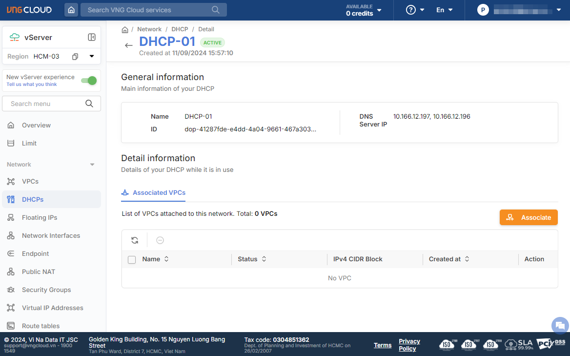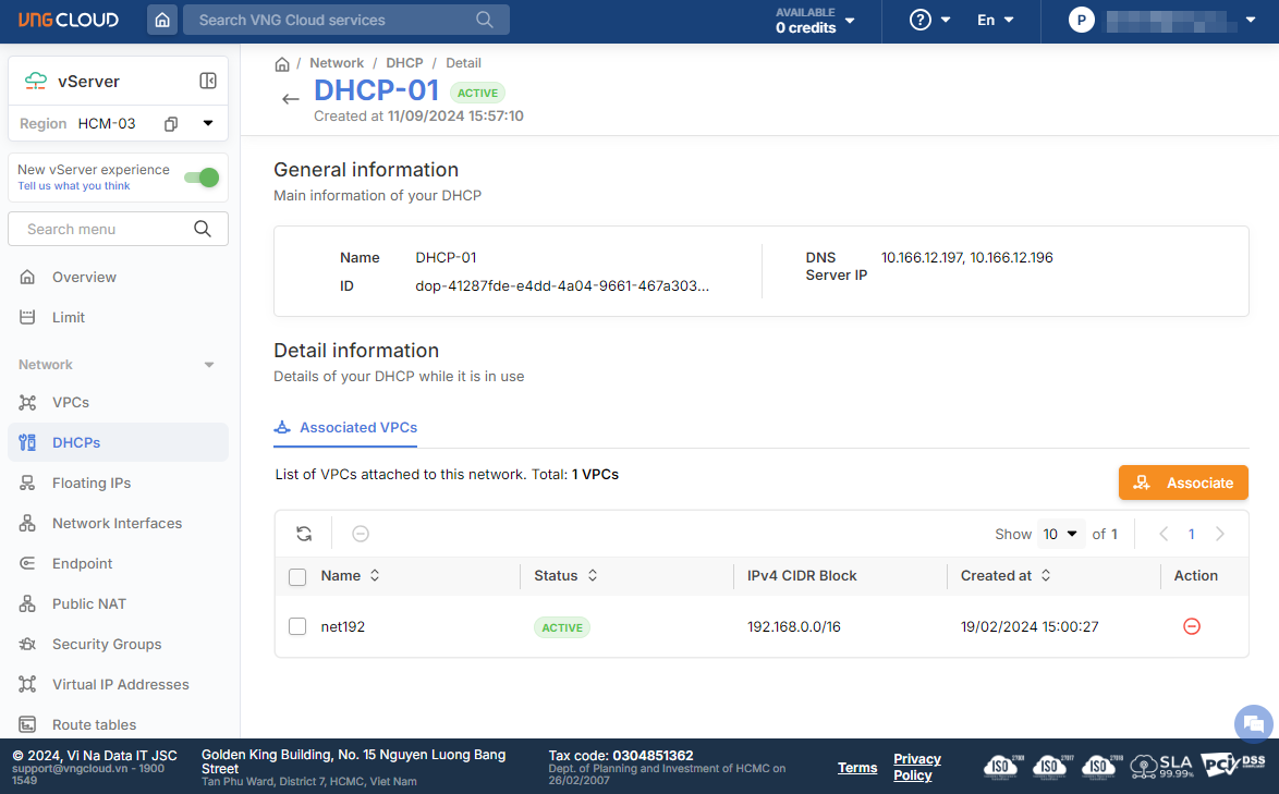 Sau khi gán thành công thì thông tin VPC được gán sẽ hiển thị ở màn hình danh sách VPC được gán vào DHCP.
