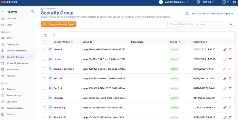 * **security\_group\_id\_list**: chỉ định danh sách security group id cần gắn vào vServer, bạn có thể lấy ở [{Tab Security Groups}](https://hcm-3.console.vngcloud.vn/vserver/network/sec-group), nếu cần tạo thêm security group bạn có thể xem tại [{Trang tạo Security Group}](https://docs.vngcloud.vn/vng-cloud-document/vn/vserver/compute-hcm03-1a/security/security-groups)