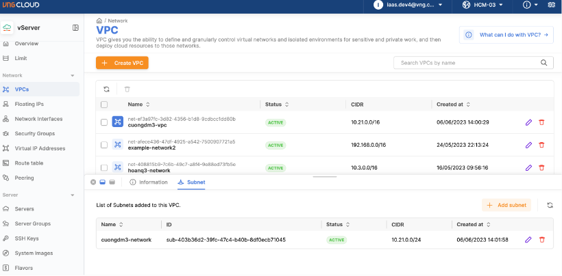 * **subnet\_id**: chỉ định subnet id mà vServer sẽ được tạo trên đó, bạn có thể lấy từ [{Tab VPC}](https://hcm-3.console.vngcloud.vn/vserver/network/vpc), nếu chưa khởi tạo bất cứ subnet nào bạn có thể xem hướng dẫn tại [{Trang tạo subnet}](https://docs.vngcloud.vn/vng-cloud-document/vn/vserver/compute-hcm03-1a/network/virtual-private-cloud-vpc)