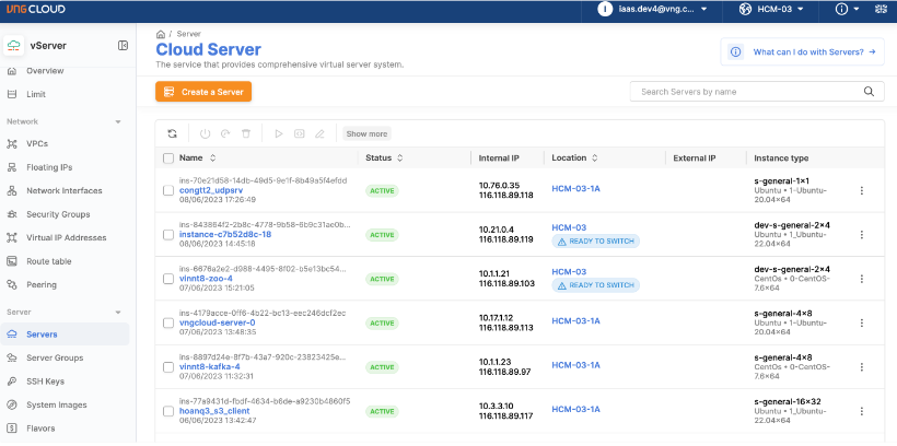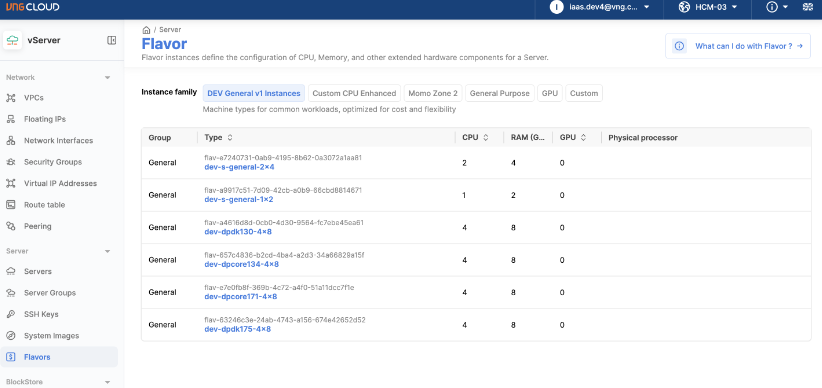 * **flavor\_id**: cấu hình vServer mà bạn sẽ khởi tạo ví dụ: flav-e2028a81-cc75-47e4-8af1-9eef2f857f84 (s-general-2x4) ,... bạn có thể xem danh sách khi tạo vServer trên Portal/ [{Tab Flavors}](https://hcm-3.console.vngcloud.vn/vserver/v-server/flavor).