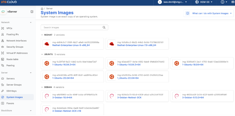 * **image\_id**: hệ điều hành để khởi tạo vServer ví dụ như: **img-b5bf635e-0456-4765-b493-31d5fcfc05aa** (1\_Ubuntu-22.04x64) ... bạn có thể xem danh sách Id khi tạo vServer trên Portal/ [{Tab System Image}](https://hcm-3.console.vngcloud.vn/vserver/v-server/system-image)