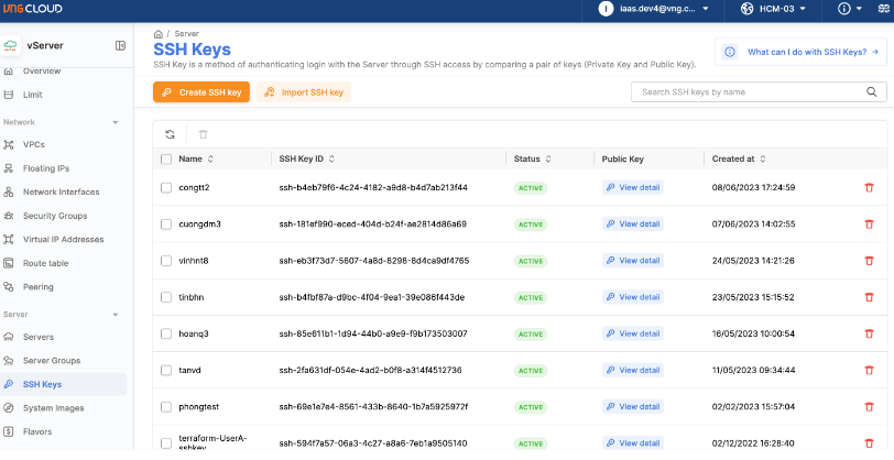 * **ssh\_key\_id**: chỉ định ssh key sẽ được inject vào vServer, bạn có thể lấy ở [{Tab SSH Keys}](https://hcm-3.console.vngcloud.vn/vserver/v-server/ssh-key), nếu chưa khởi tạo bất kì ssh key nào bạn có thể xem tại [{](https://docs.vngcloud.vn/pages/viewpage.action?pageId=49647901)[T](https://docs.vngcloud.vn/pages/viewpage.action?pageId=49647901)[rang tạo SSH key](https://docs.vngcloud.vn/vng-cloud-document/vn/vserver/compute-hcm03-1a/security/ssh-key-bo-khoa)[}](https://docs.vngcloud.vn/pages/viewpage.action?pageId=49647901):