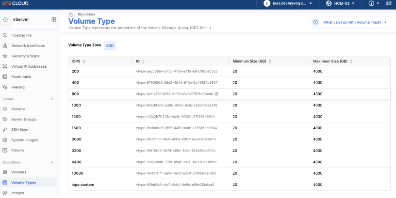 * **volume\_type\_name**: chỉ định IOPS cho root disk và data disk, ví dụ: **SSD-3000, SSD-200, SSD-400,** bạn có thể xem danh sách Volume Type trên vServer Portal/ [{Tab Volume Type}](https://hcm-3.console.vngcloud.vn/vserver/v-server/system-image)