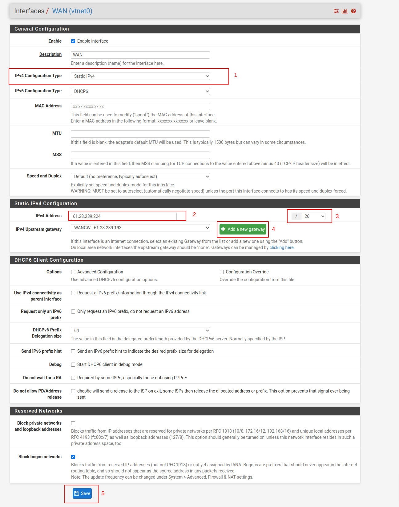 * Tại mục ***Static IPv4 Configuration***: ở thuộc tính ***IPv4 Address***, nhập IP public của server pfsense (thông tin xem tại website vServer) với subnet /26 **(2 và 3)**