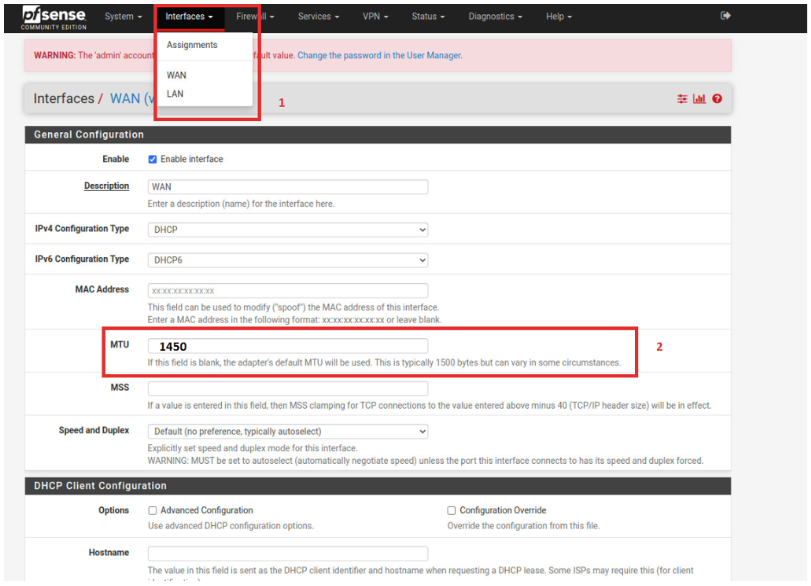 **PFSense: WEB UI - Interfaces - WAN - MTU = 1450**