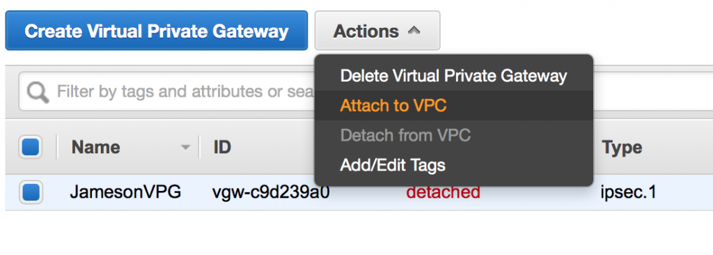 Chọn vào VPG vừa tạo và nhấn chọn Attach to VPC