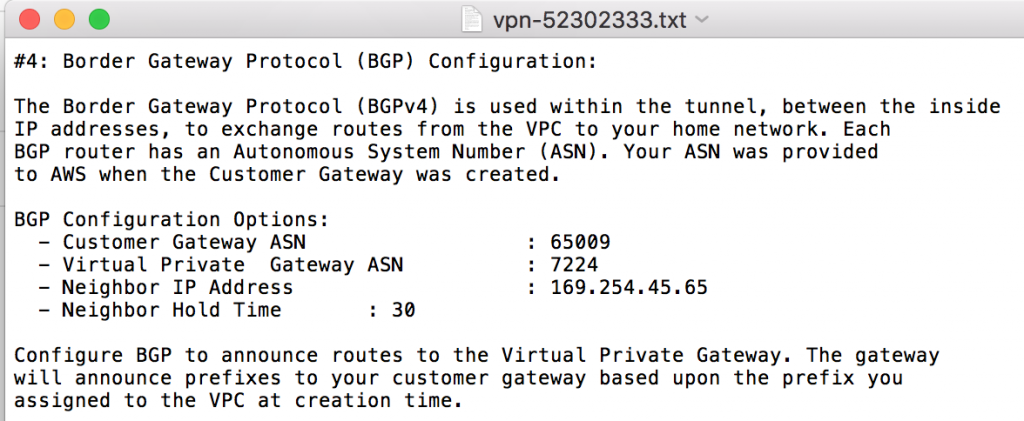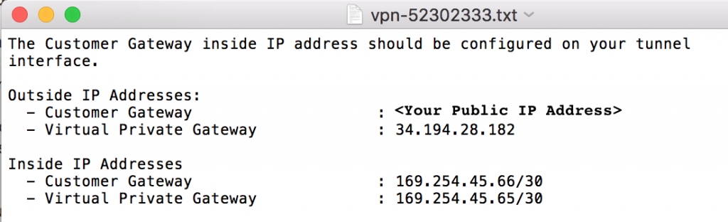 Trọng tệp tin cấu hình mà bạn đã tải xuống từ AWS, cuộn xuống tới khi tìm thấy Outside IP Addresses và tìm IP Virtual Private Gateway . Đậy là IP Public ta muốn đưa vào pfSense cho Remote Gateway.