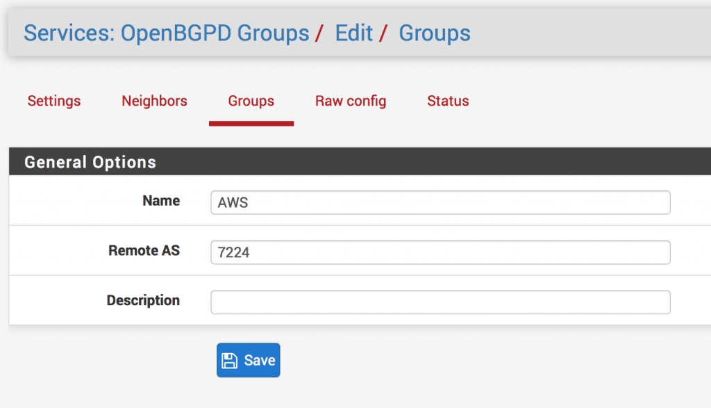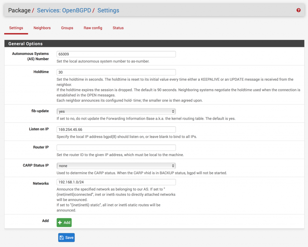 Đến màn hình Services -> OpenBGPD ( Tất cả thông tin sau có thể được tìm thấy ở đoạn #4 Border Gateway Protocol (BGP) Configuration section của tệp tin cấu hình đã tải).
