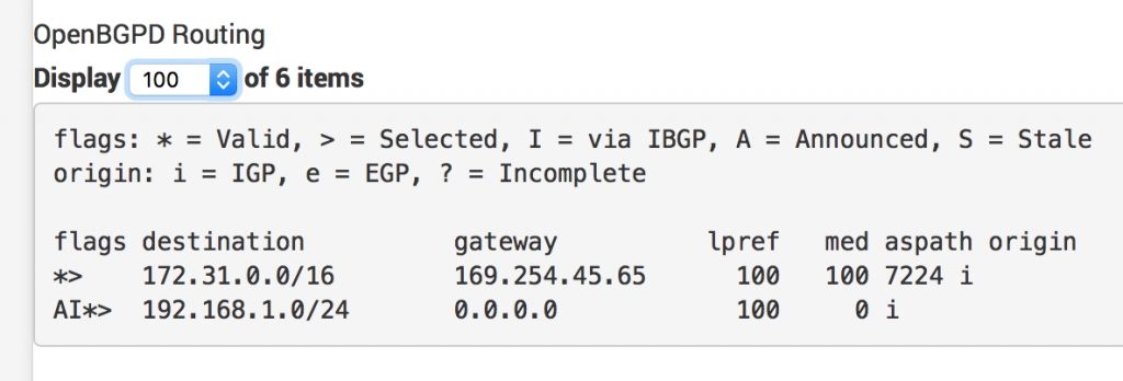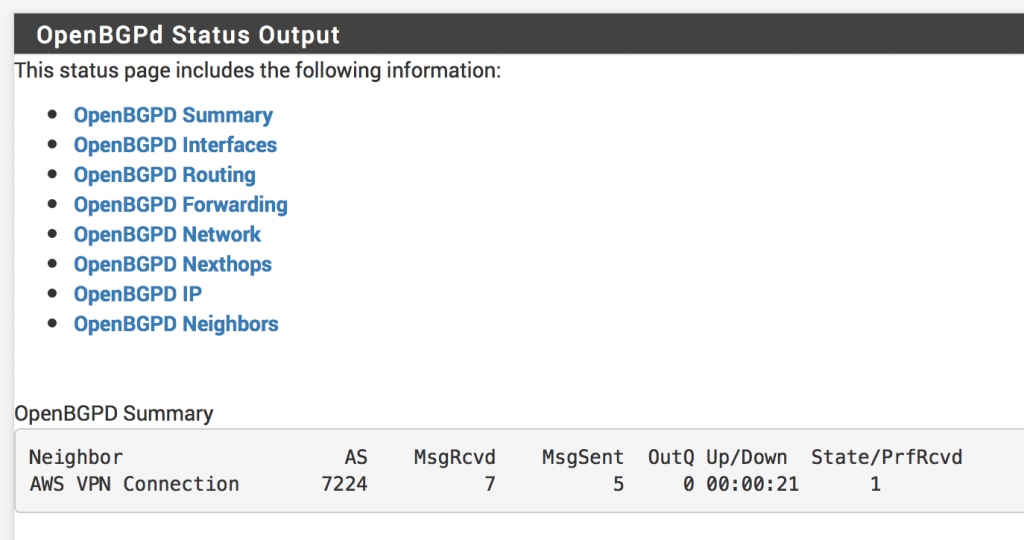Nếu mọi thức hoạt động đúng, ta thấy được thời gian kết nối ở cột Up/Down của bảng OpenBGPD Summary và thông tin theo đó được thay đổi.