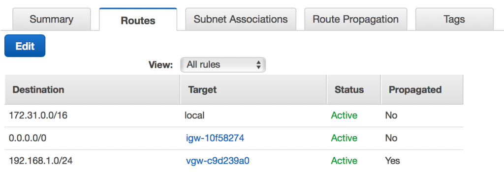 Trở lại AWS, chúng ta có thể kiểm tra các bảng định tuyến cho VPC của mình. Trong bảng điều khiển, kiểm tra một bảng định tuyến. Khi bạn nhấp vào tab Routes , bạn nên thấy các định tuyến từ pfSense được phát tán đến AWS.