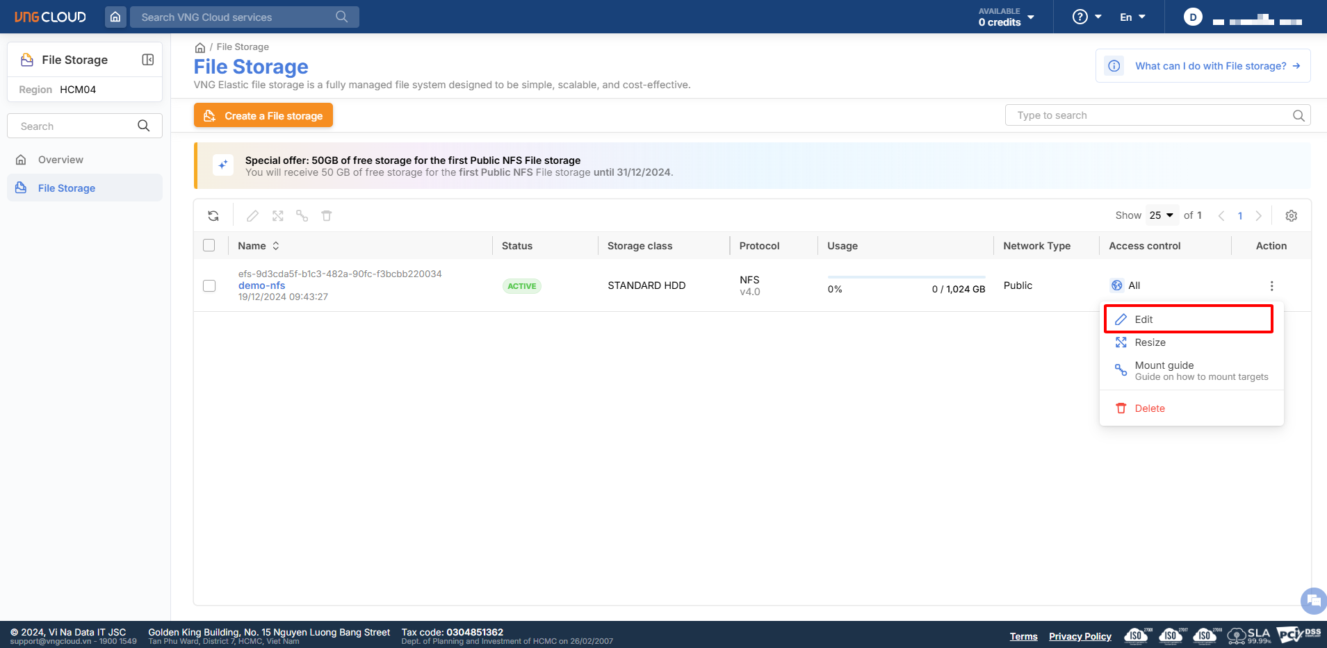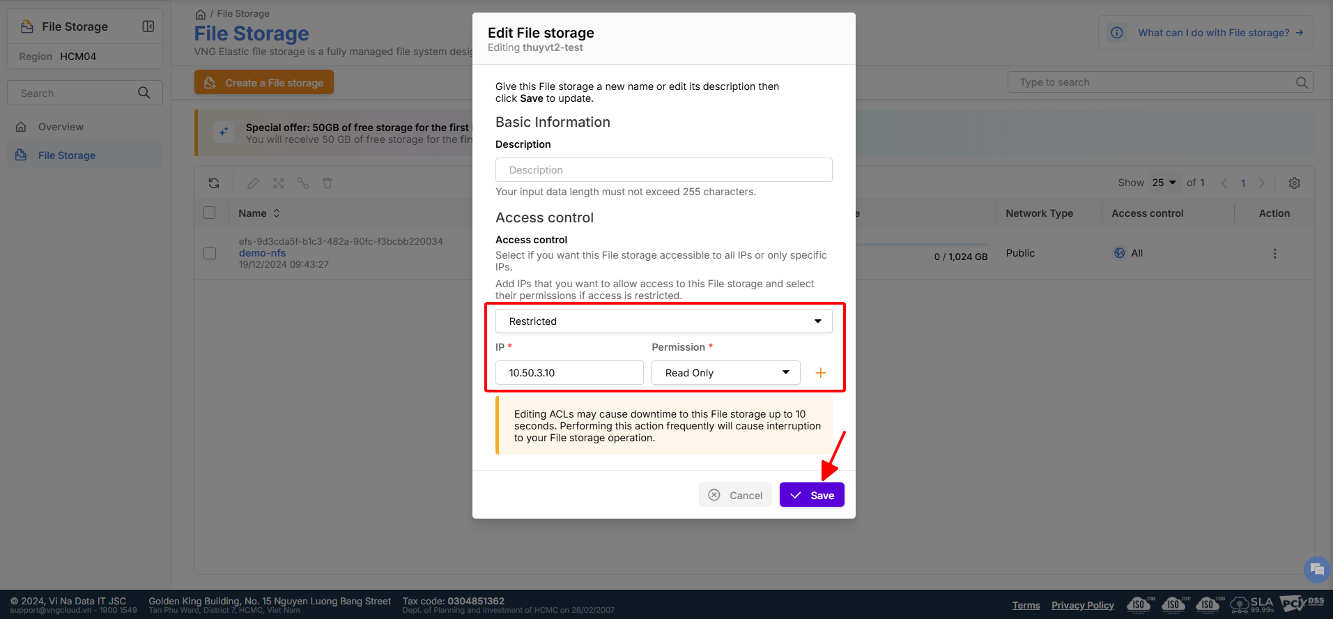 Đối với file storage NFS: Cho phép chỉnh sửa quyền truy cập (ACL) trực tiếp trên file bằng cách chọn Edit trên file storage bạn muốn chỉnh sửa. Tuy nhiên, việc chỉnh sửa ACL có thể gây gián đoạn cho File storage này lên đến 10 giây. Thực hiện hành động này thường xuyên sẽ gây gián đoạn cho File storage của bạn.