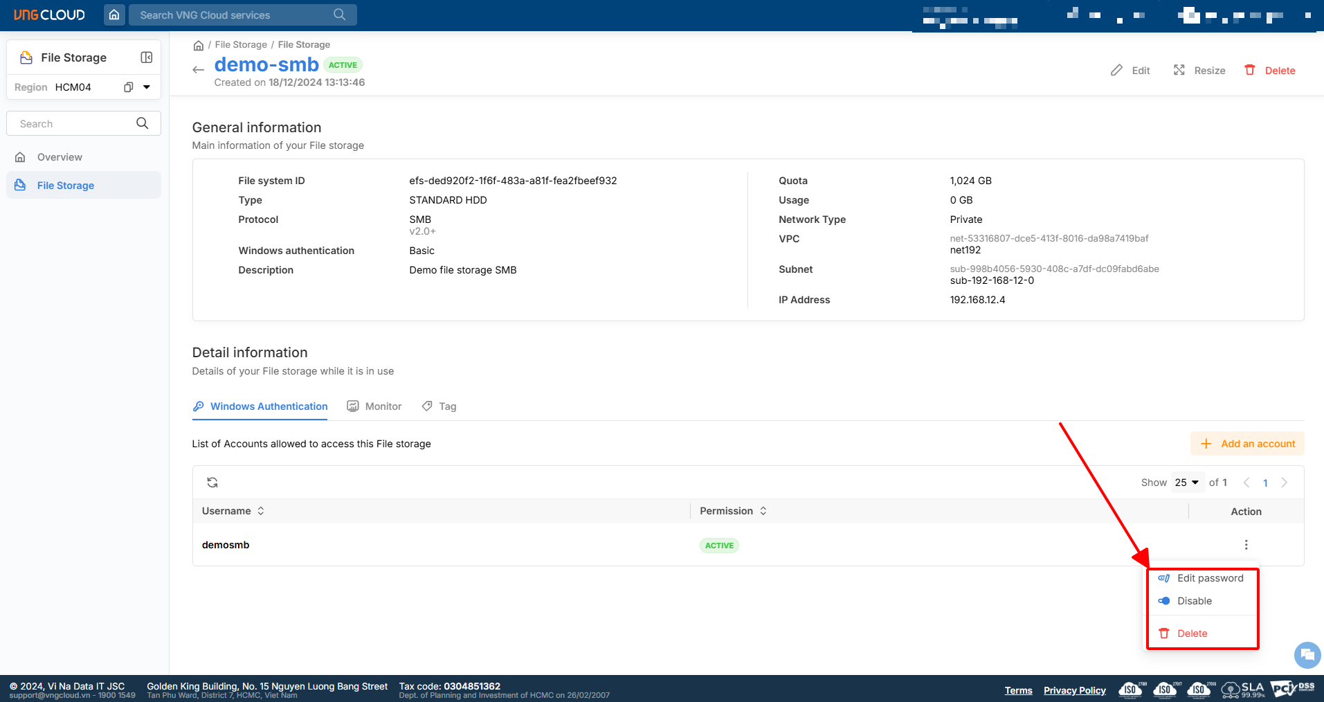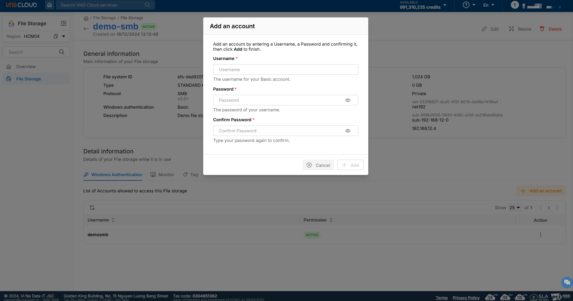 Đối với file storage SMB sử dụng Basic Authentication: Cho phép thực hiện các thao tác như thêm mới tài khoản, vô hiệu hóa, thay đổi mật khẩu, hoặc xóa các tài khoản authentication đã tạo.