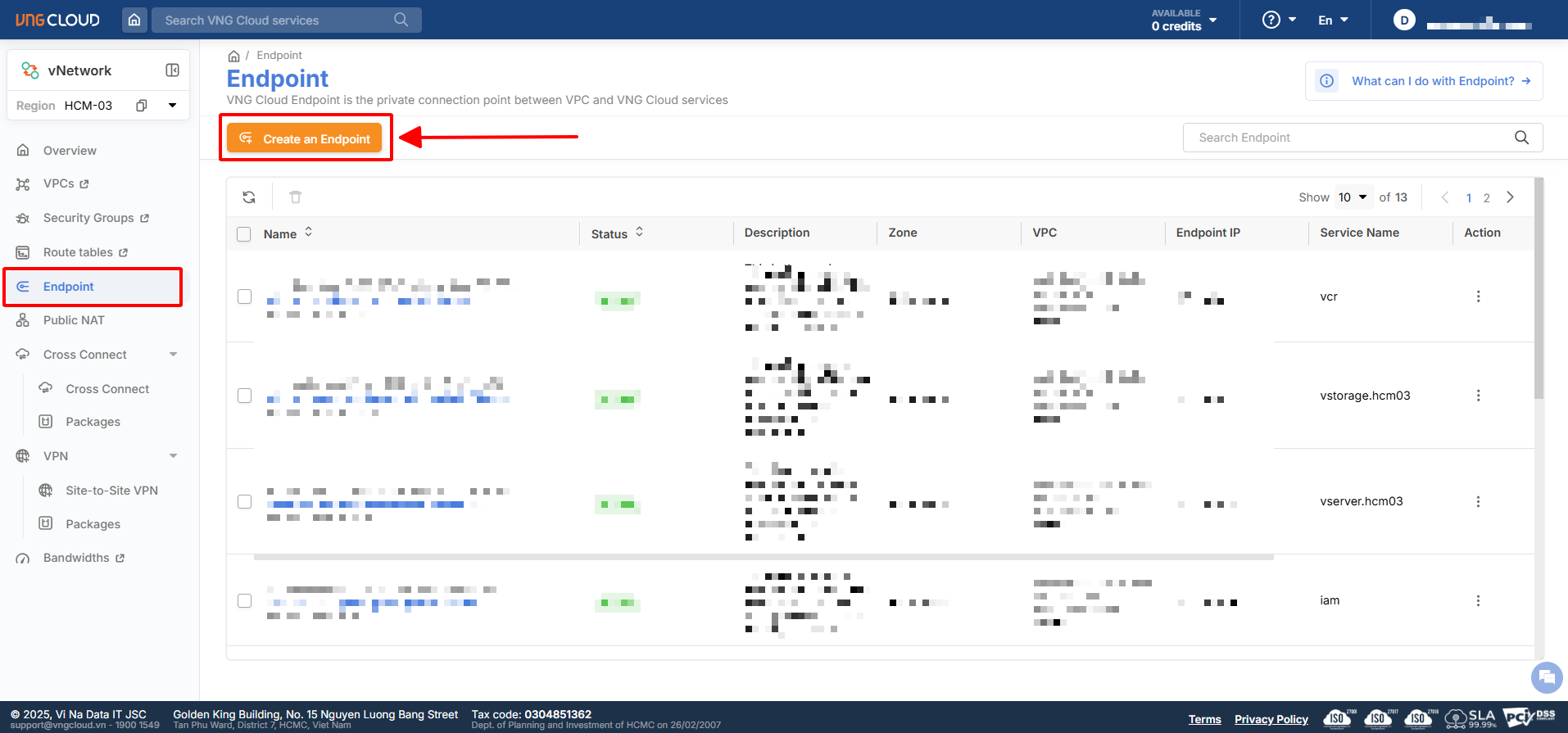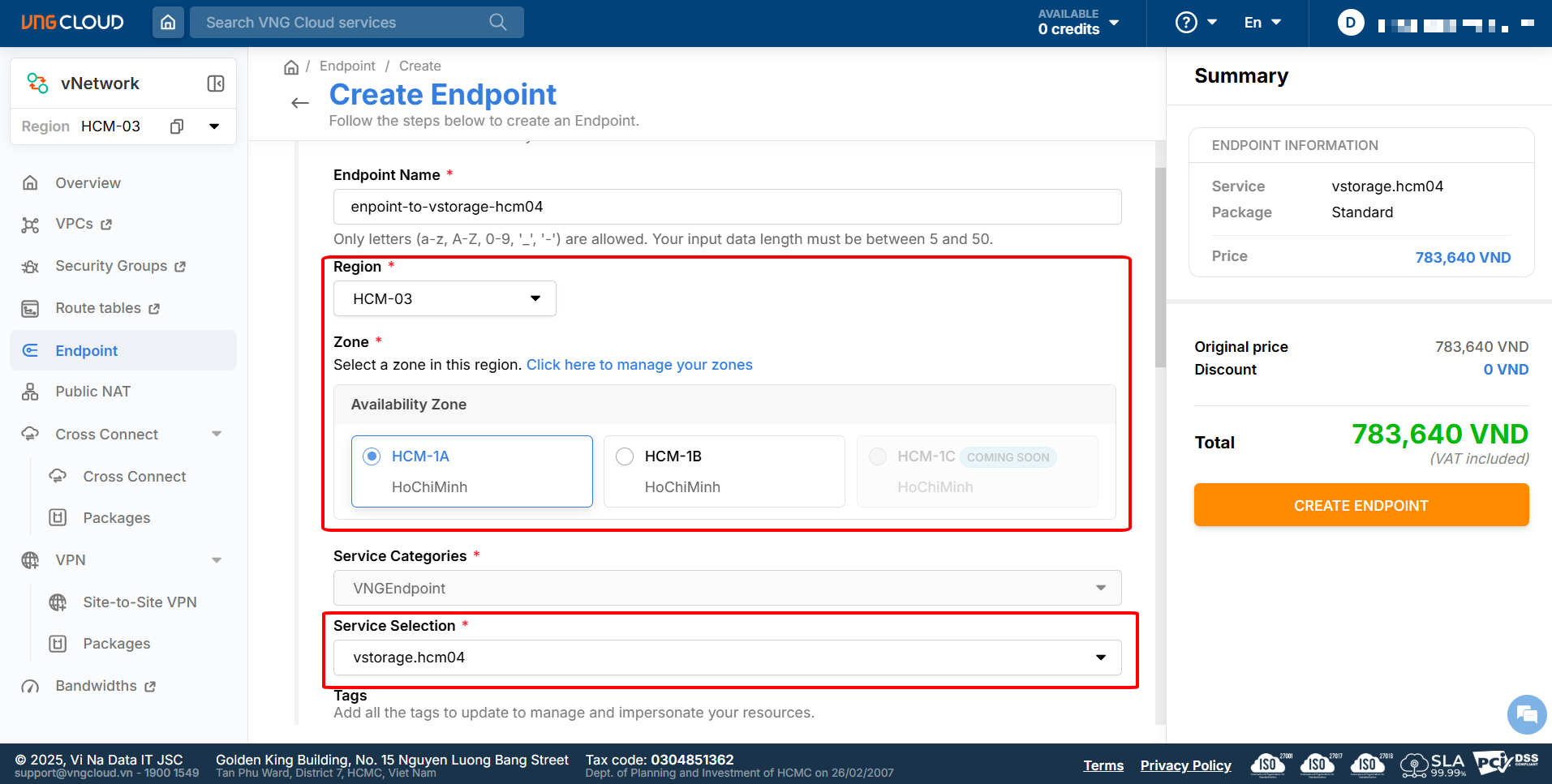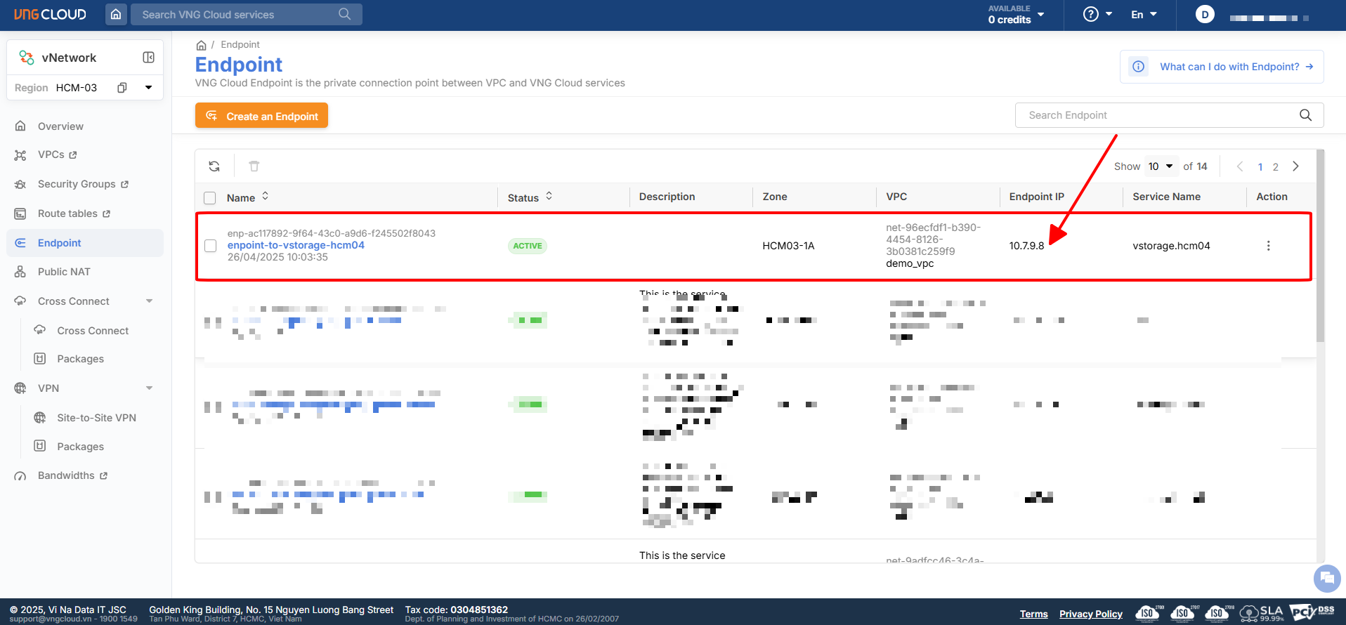 * `vstorage.hcm03`: nếu bạn muốn endpoint này sẽ tạo kết nối từ máy chủ của bạn tới vStorage trên region **HCM03**.