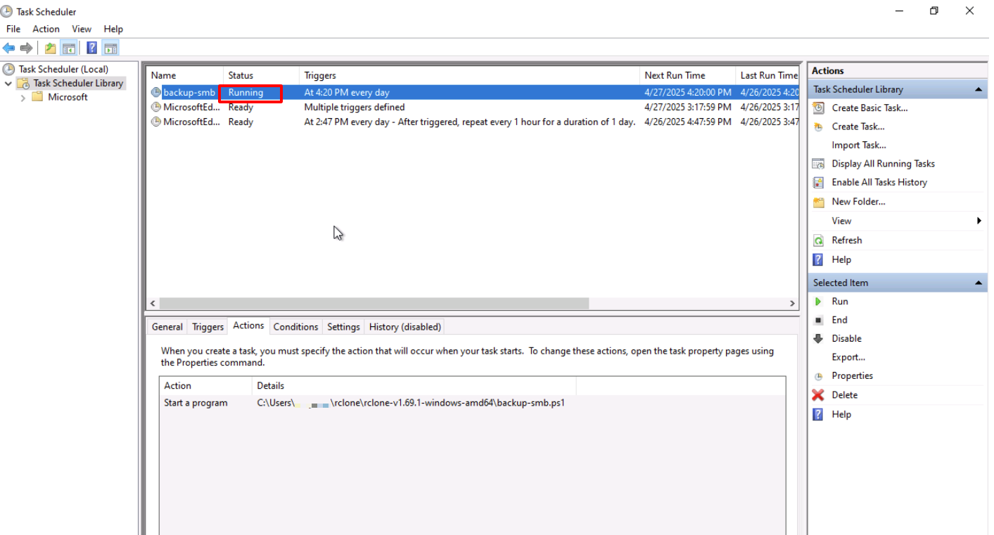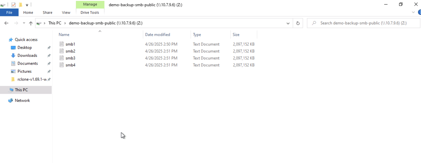 C:\Users\<Your Account>\rclone\rclone-v1.69.1-windows-amd64>\rclone.exe copy --progress --metadata --checksum --transfers 8 --checkers 8 Z:\ vstorage:smb-backup