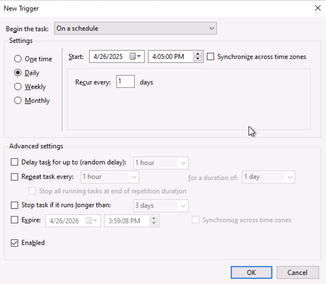 Ví dụ dưới tôi đã cấu hình lịch chạy hằng ngày lúc 16h:05