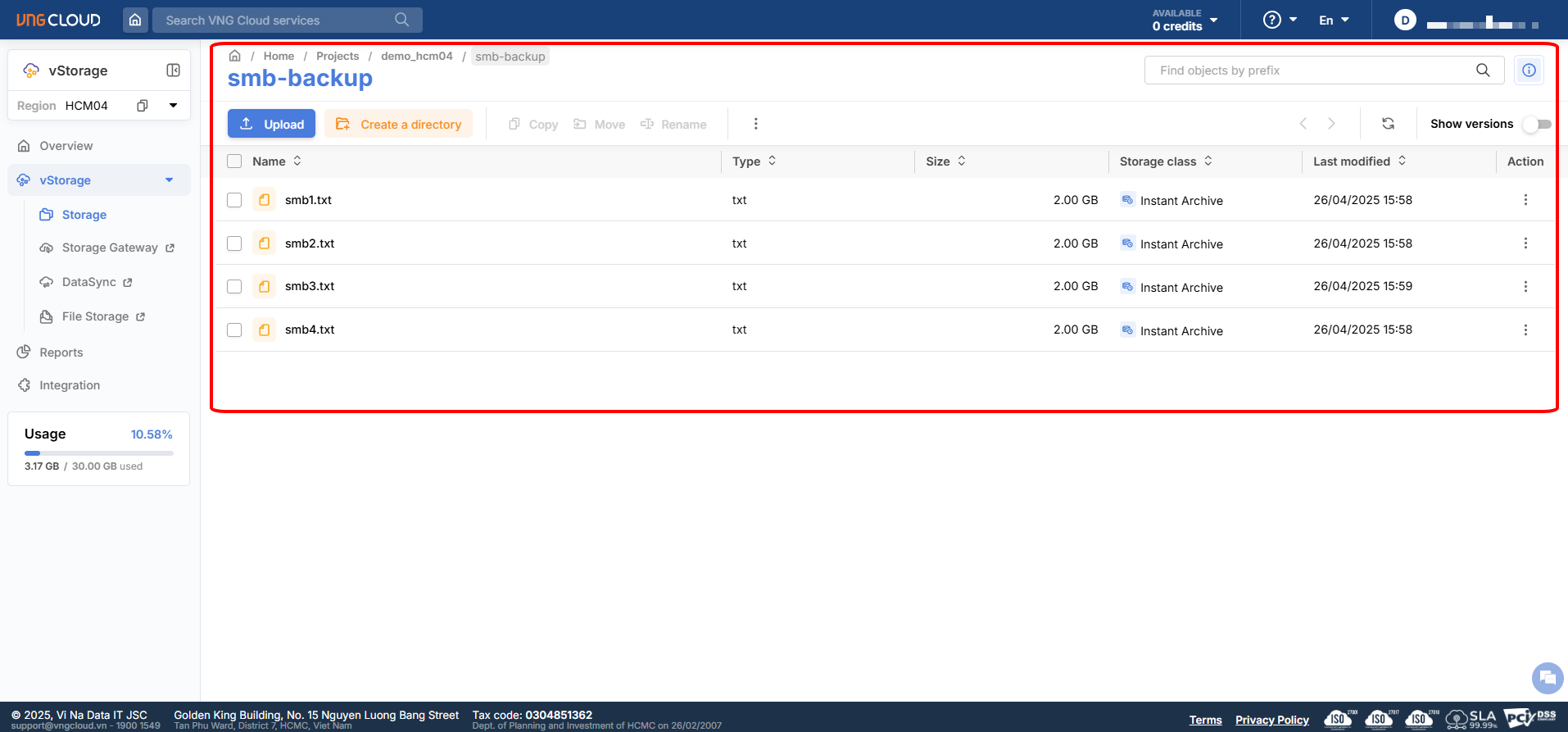 Tiếp theo, tôi sẽ backup các file ở ổ `demo-backup-smb-public` này vào `smb-backup` bucket trên vStorage HCM04.