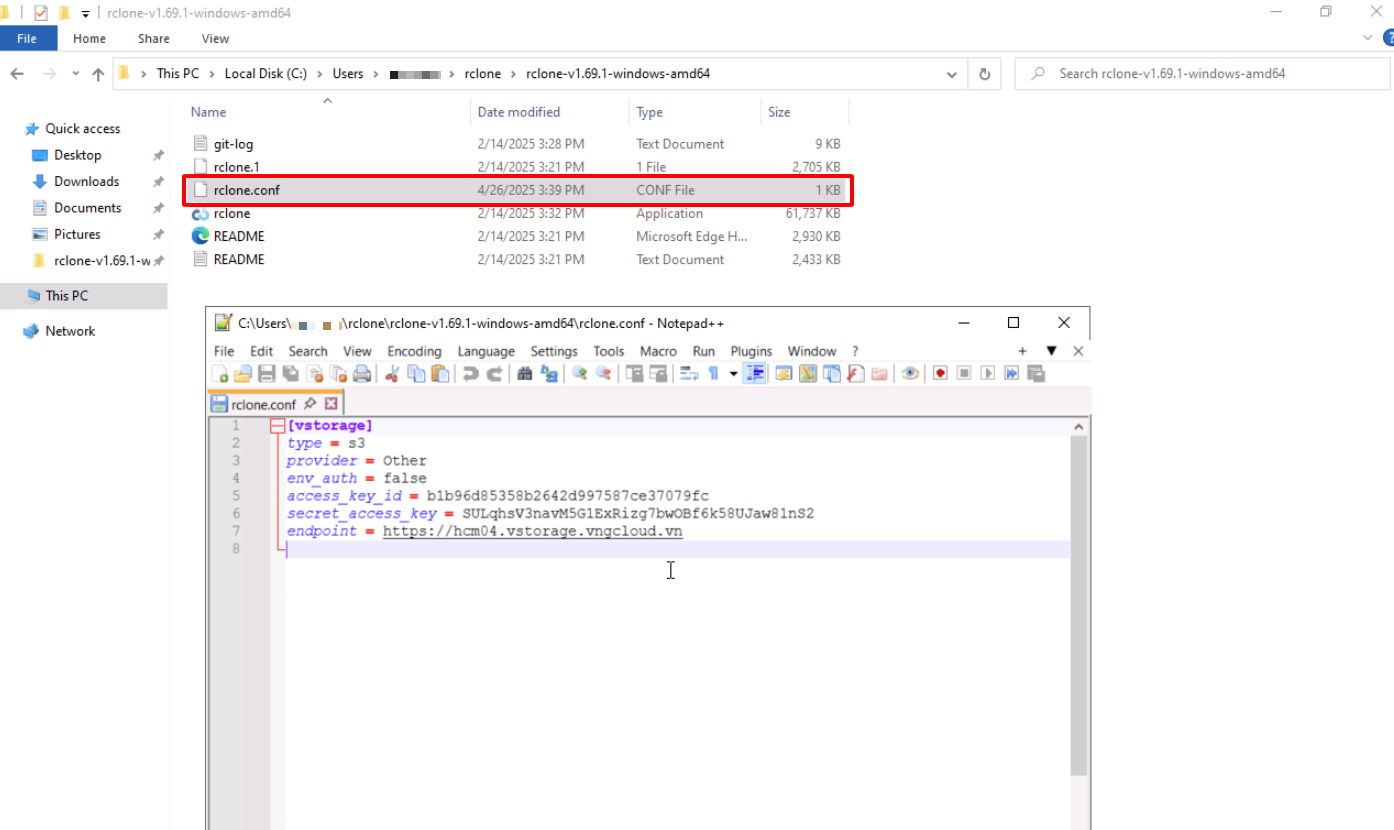 * Tại thư mục rclone vừa được giải nén, thực hiện tạo file `rclone.conf`
