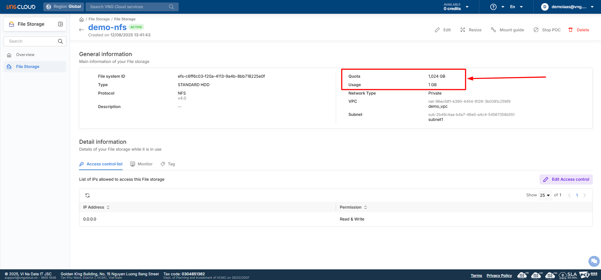 share: /demo-nfs    # mountpoint (lấy từ thông tin mount guide trên File Storage Portal)