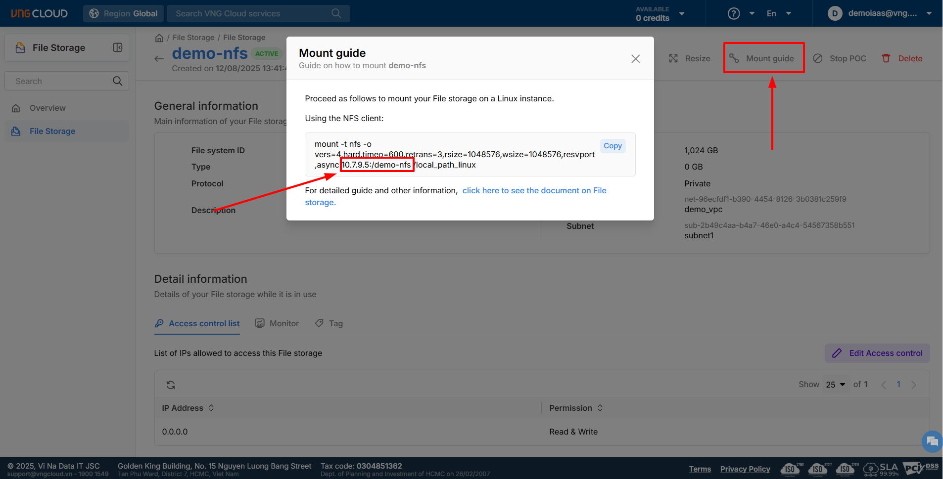 * Đầu tiên, bạn cần lấy thông tin mount của File Storage NFS: Trên giao diện File Storage Portal, chọn **Mount guide** và lưu các thông tin IP cũng như folder thực hiện mount.