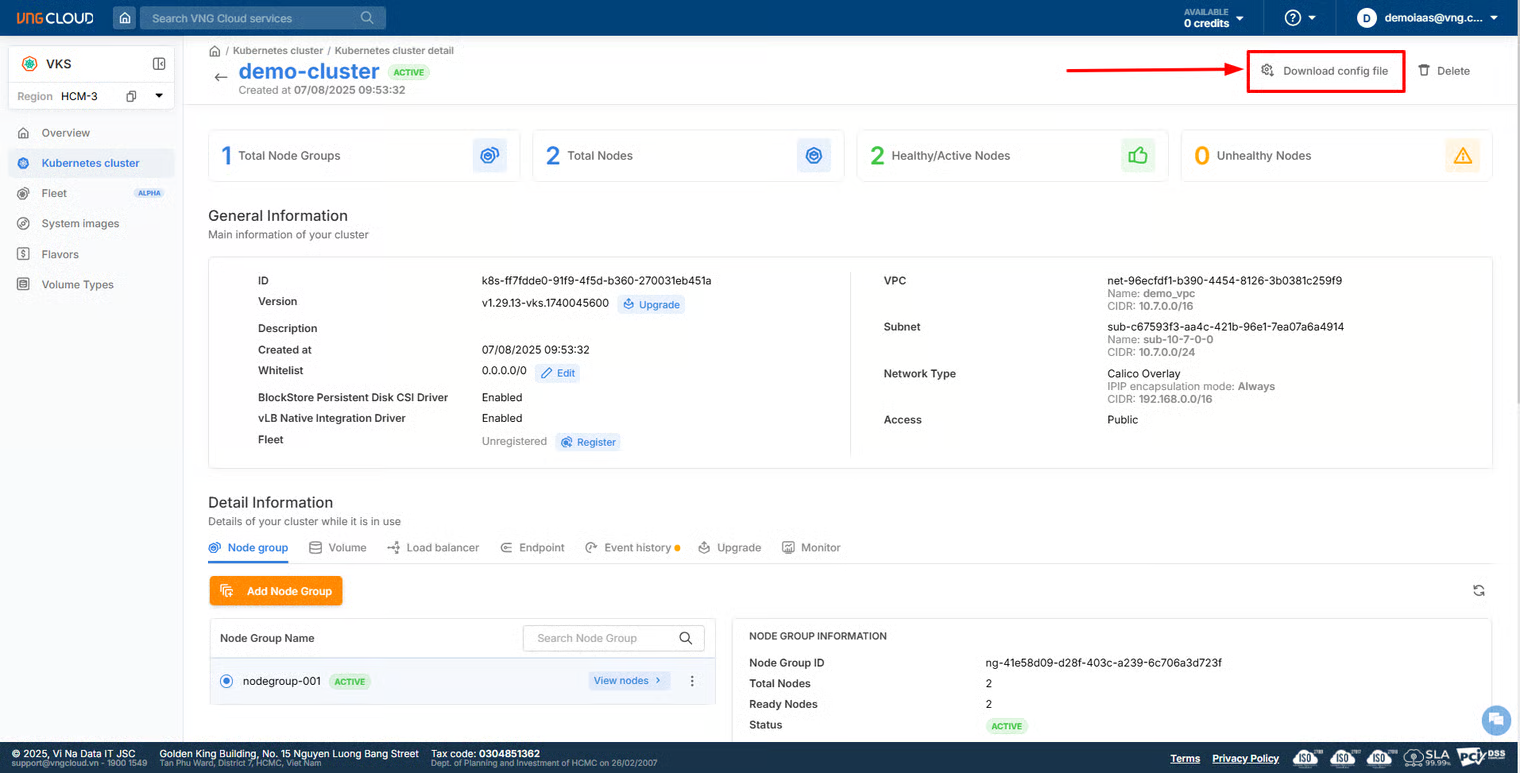 * Đầu tiên, bạn cần tải file cấu hình: Trên giao diện VKS Portal, chọn **Download Config File** và tải về file `kubeconfig`. File này chứa thông tin xác thực để kết nối đến cluster.