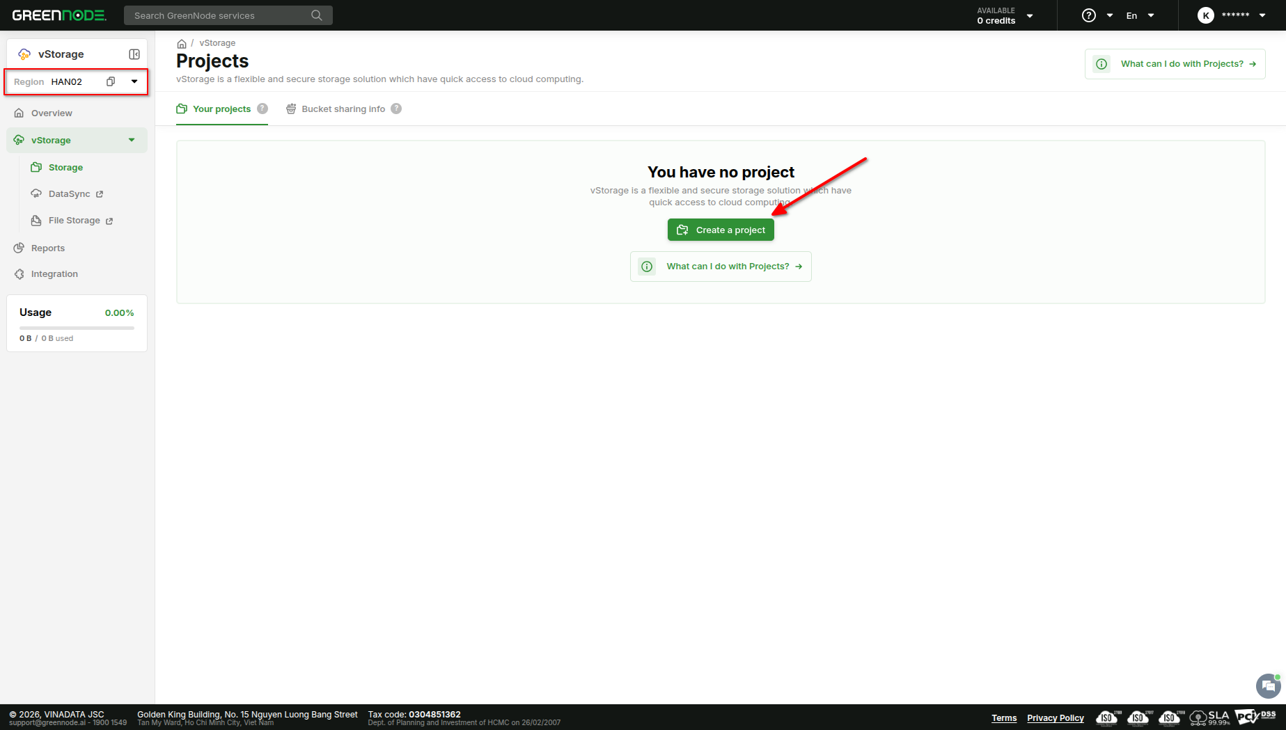 Bắt đầu sử dụng dịch vụ, bạn cần tạo một project. Một Project là một thuật ngữ trên vStorage thể hiện một gói lưu trữ với dung tích cụ thể mà bạn thực hiện mua sắm trên GreenNode. **Với Region HAN02, tại một thời điểm&#x20;**<mark style="color:red;">**bạn có thể sở hữu tối đa 10 Project**</mark>**&#x20;và sử dụng chúng để tổ chức lưu trữ dữ liệu của bạn.**